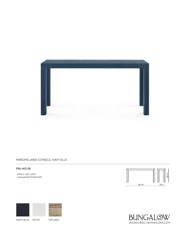 The Villa & House Parsons Large Console Table in Deep Navy takes inspiration from the Parsons Table developed in the 1930s. This modern console table features a lacquered grasscloth finish that is a perfect fit for home and office interiors.