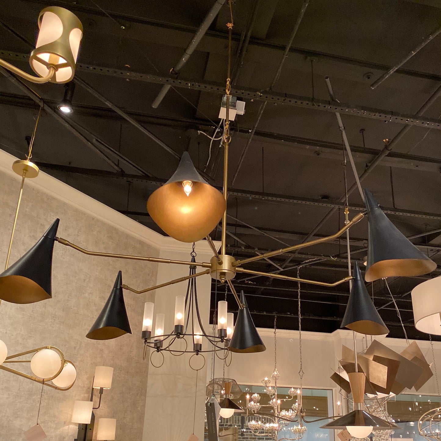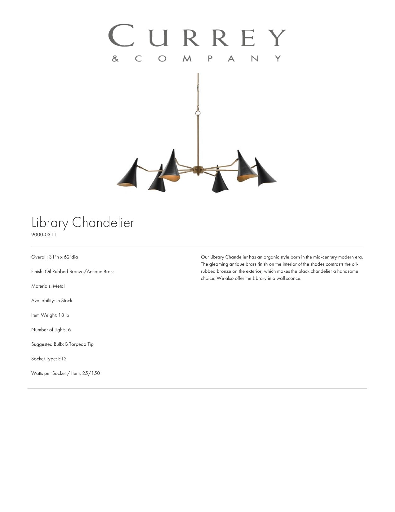 The shades of the Library Chandelier from Currey and Company delivers an organic feel that was born during the mid century modern boom when artists were experimenting with form in design. The gleaming antique brass finish on the interior of the oil-rubbed bronze shade makes it an ideal choice for above the dining room table or in a statuesque great room.