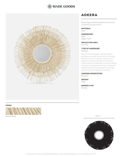 Crafted by Made Goods, the Adeera Mirror boasts a natural white cane frame for a touch of sophistication and charm. Its circular shape adds a distinctive and organic aspect, making it a must-have for those seeking a stylish accent.