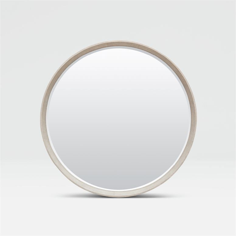 The Emma Mirror in Sand Faux Shagreen from Made Goods is simple perfection. Material covers both sides of a thin, dramatic three-inch ring, surrounding a Beveled center mirror. This mirror has a shadow box style frame with an approximate 3'' depth.