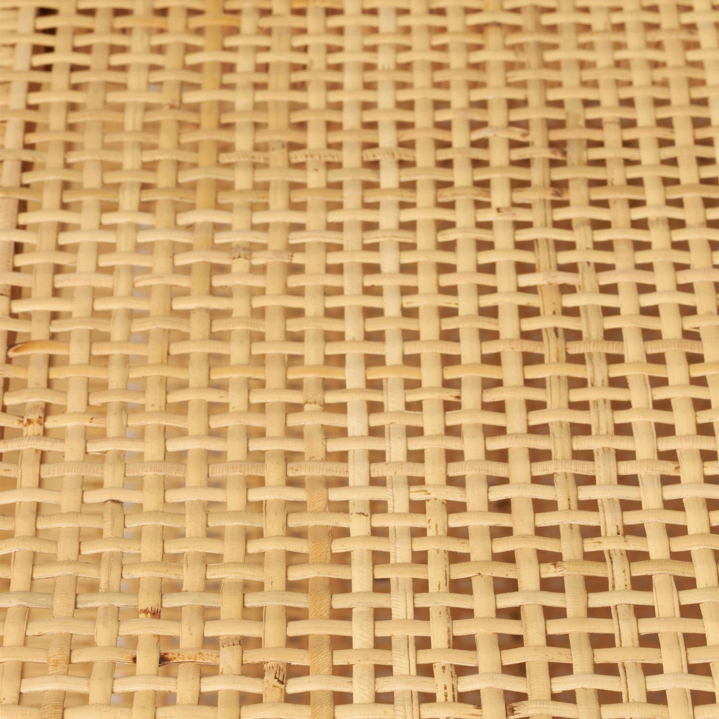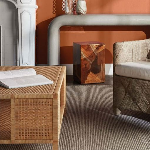 The Isla Coffee Table in Natural Peeled Rattan from Made Goods is an inviting expanse of tightly woven peeled rattan, reinforced by a box-stretcher frame. A peeled rattan lower shelf is semi-enclosed by two square, woven rattan panels at each corner. Delivering an effortlessly curated vibe for your home, each Isla is handcrafted and unique.