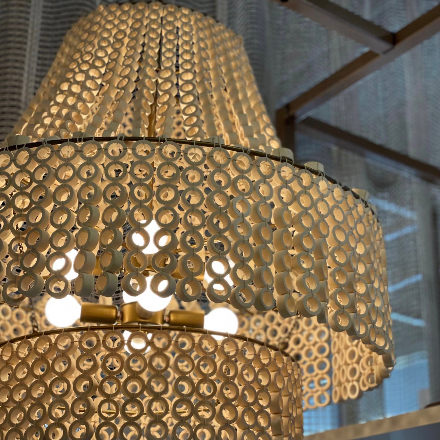 Its oversized scale makes the Hannie Chandelier in White Wood from Arteriors Home the ultimate statement piece. Suspended by an antique brass pipe, a beaded white wood empire silhouette lays the foundation for creative detailing, including hand-carved circular beads that layer to diffuse light throughout a space.