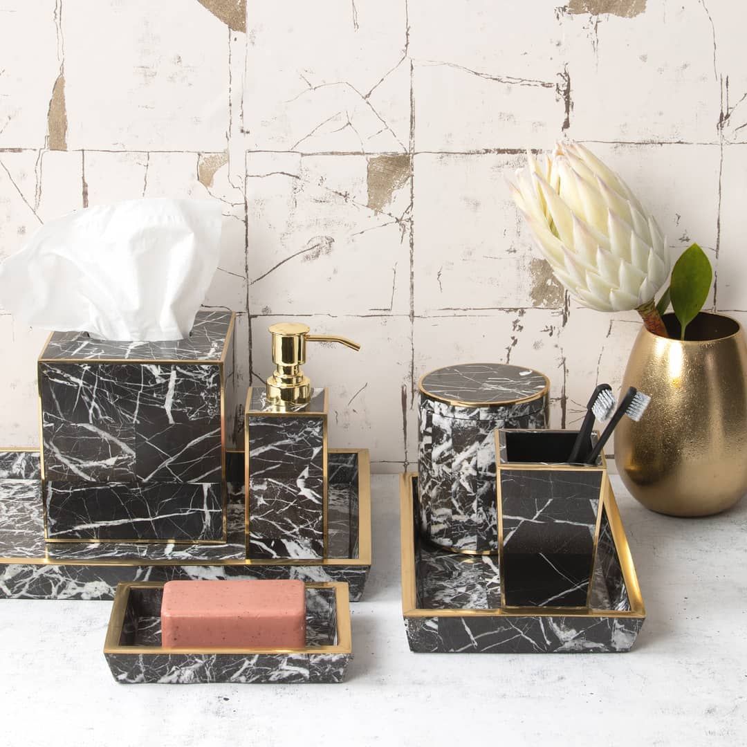 The Rhodes Tissue Box in Nero Marble and Brass Metal from Pigeon and Poodle features velvety, white-veined black marble that goes next level with handsome brass trim. Pair with all the luxurious pieces of the Rhodes Accessory Collection for the total look.