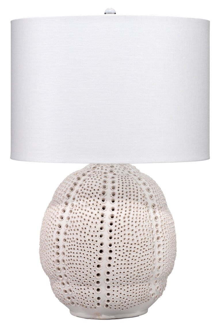 The Jamie Young Lunar Table Lamp features perforated patterns on its curved and dimpled base, inspired by the craters, mountains, and seas on the surface of the moon.