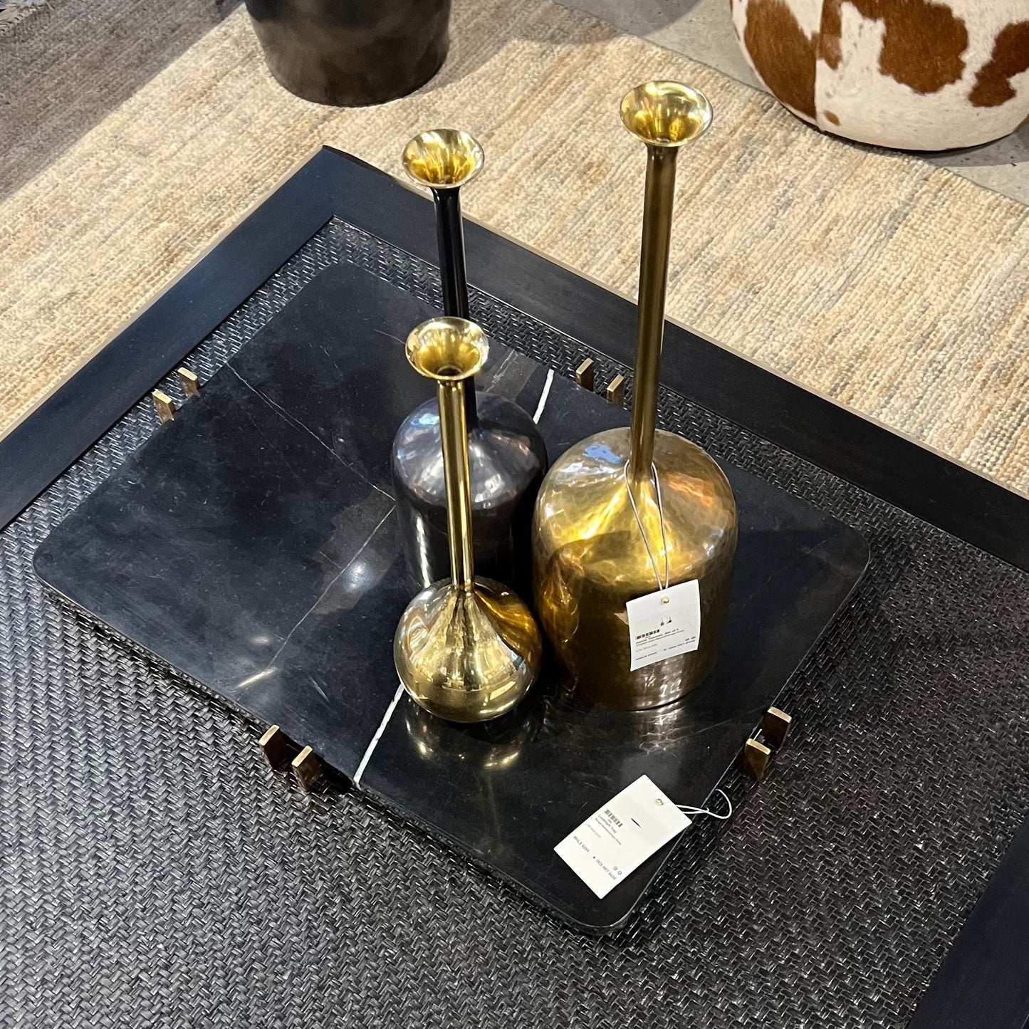 Let the stage of your display be a part of the presentation. The Lockhart Tray from Arteriors Home is made from gorgeous veined bengal marble and is an eye-catching piece on its own with its elaborate rust-colored textures.