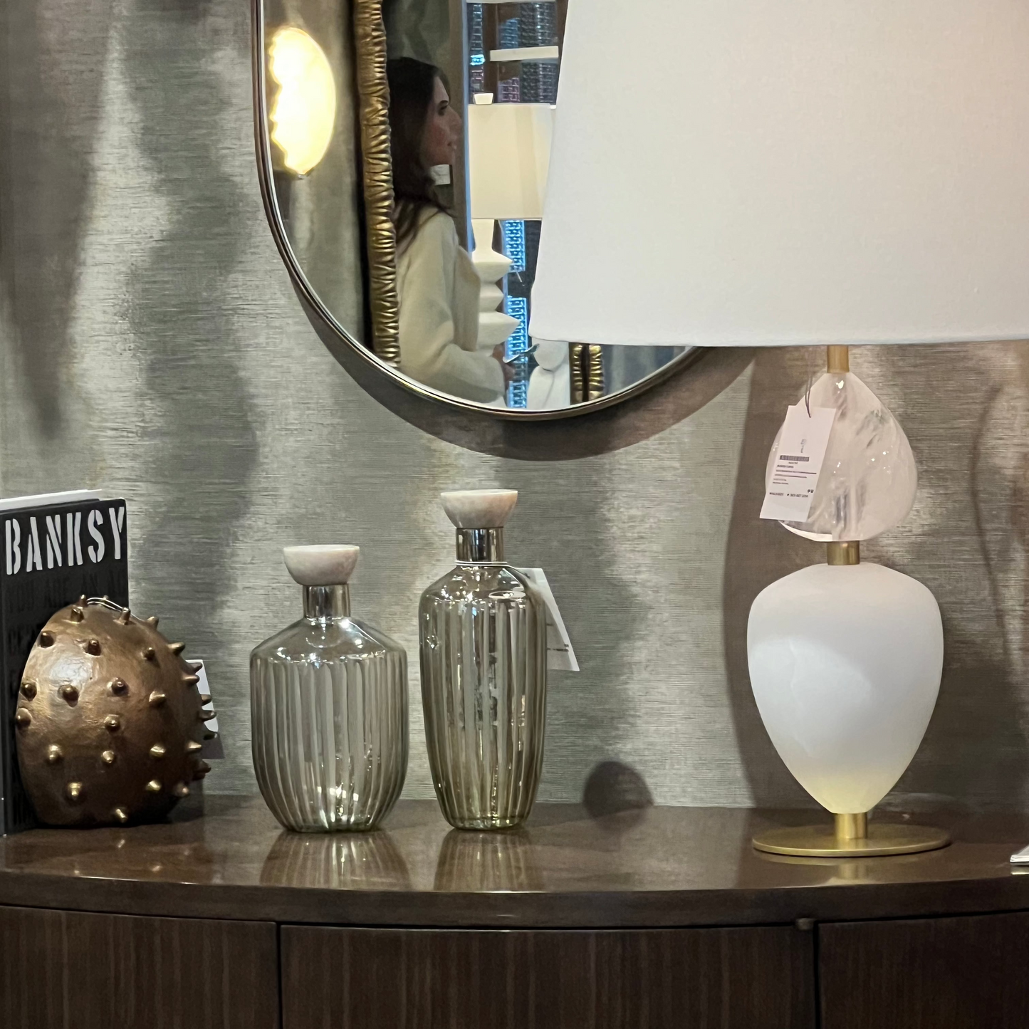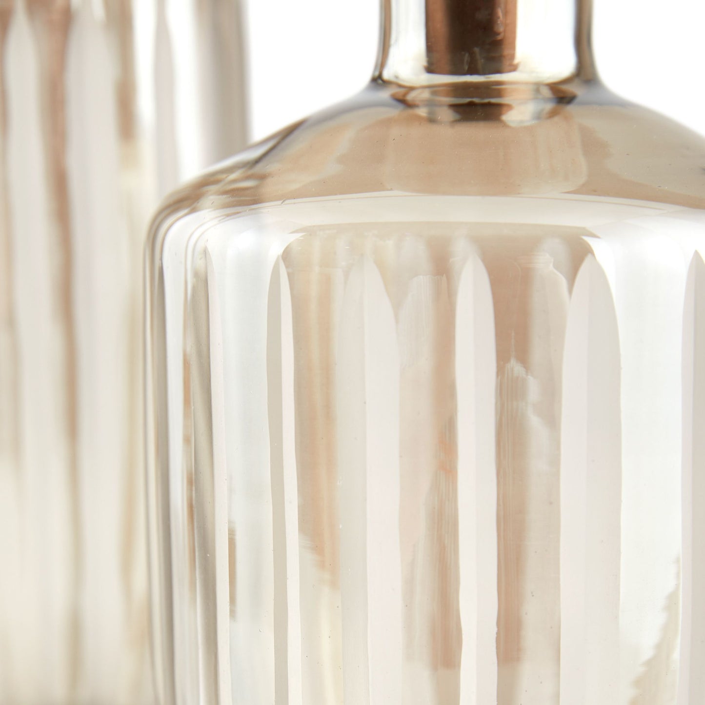Inspired by vintage perfume decanters, the Arielle Decanters Set of 2 in Smoke Luster and Marble from Arteriors Home features ribbed vessels of smoke luster-cut glass. The Arielle Decanters are topped with sculptural stoppers of gray marble and accented with nickel finished brass details.