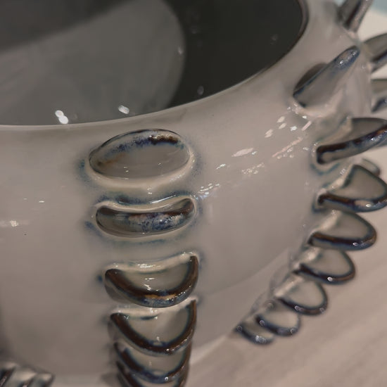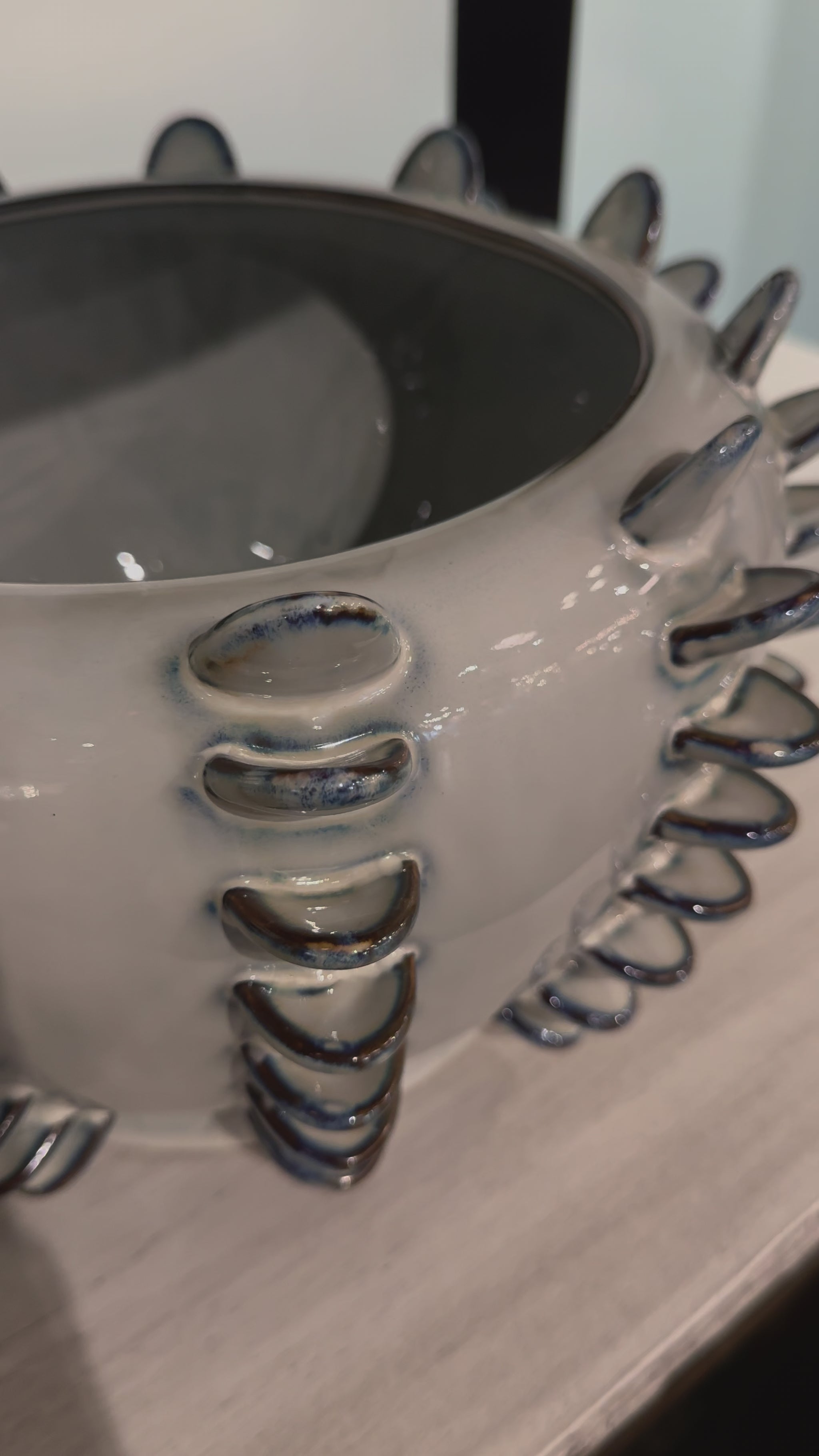 The porcelain Ailee Vase in Reactive Blue from Arteriors Home features a spiny sea urchin silhouette and a marine-inspired reactive blue glaze that varies in depth towards its textural accents.