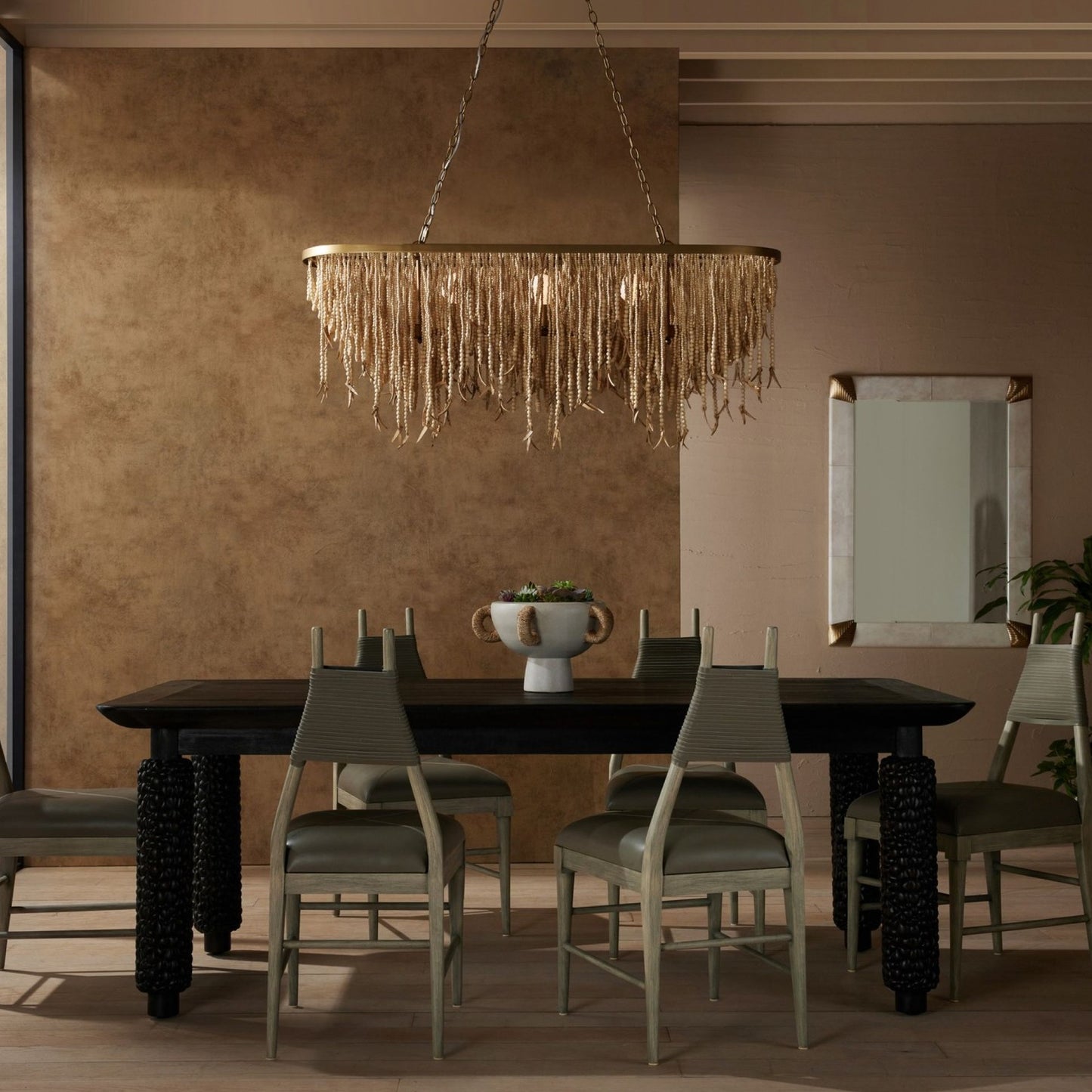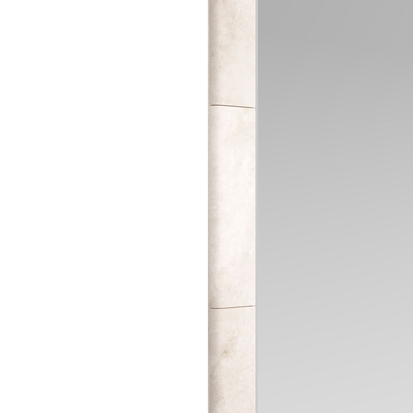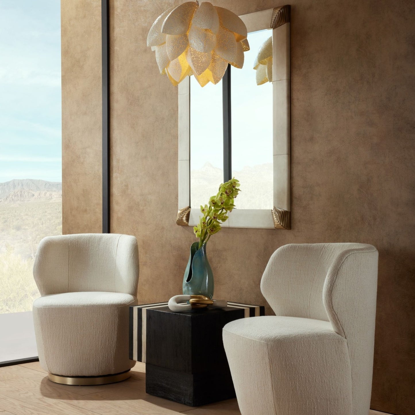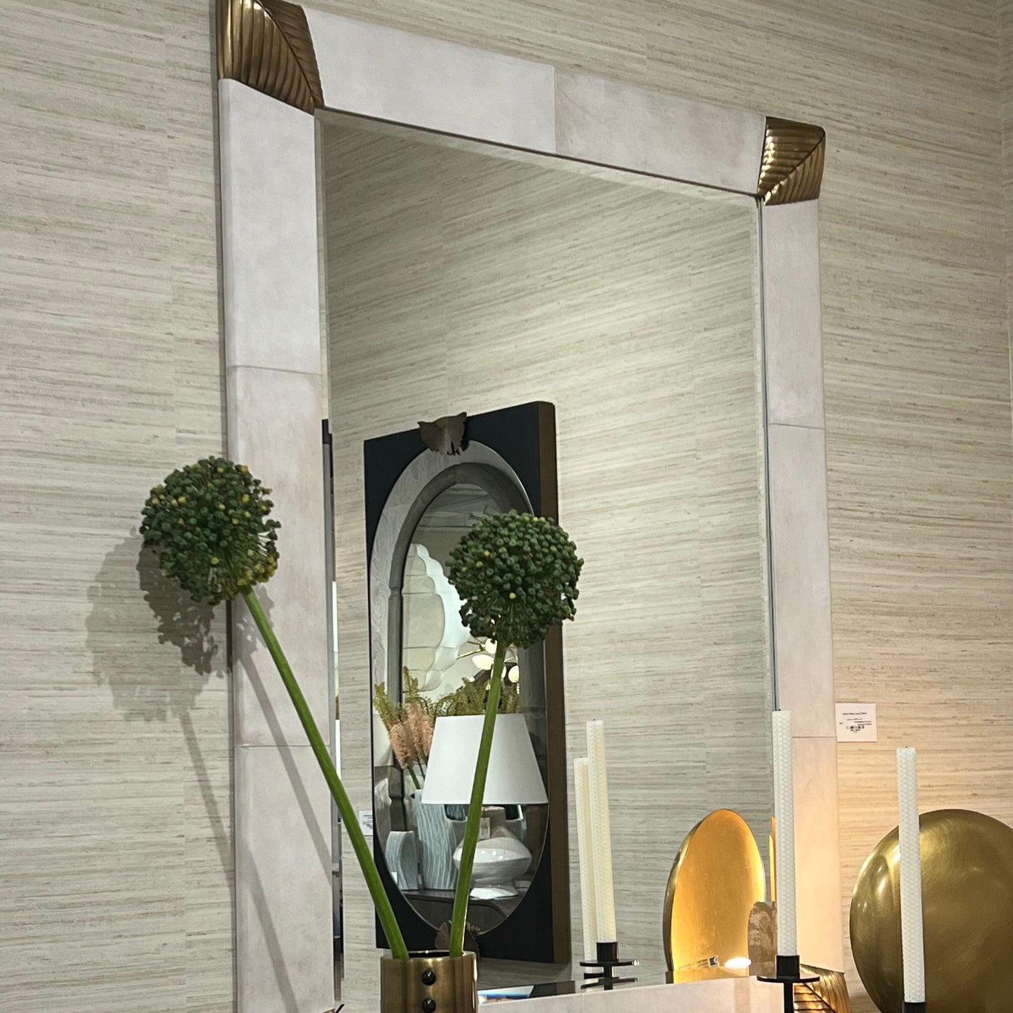 The Amara Mirror Ivory Vellum by Arteriors Home boasts a sleek and modern design, featuring streamlined details and a rectangular shape. Expertly wrapped in ivory vellum, this mirror is enhanced with antique brass corners that highlight its sharp angles and precise dimensions.