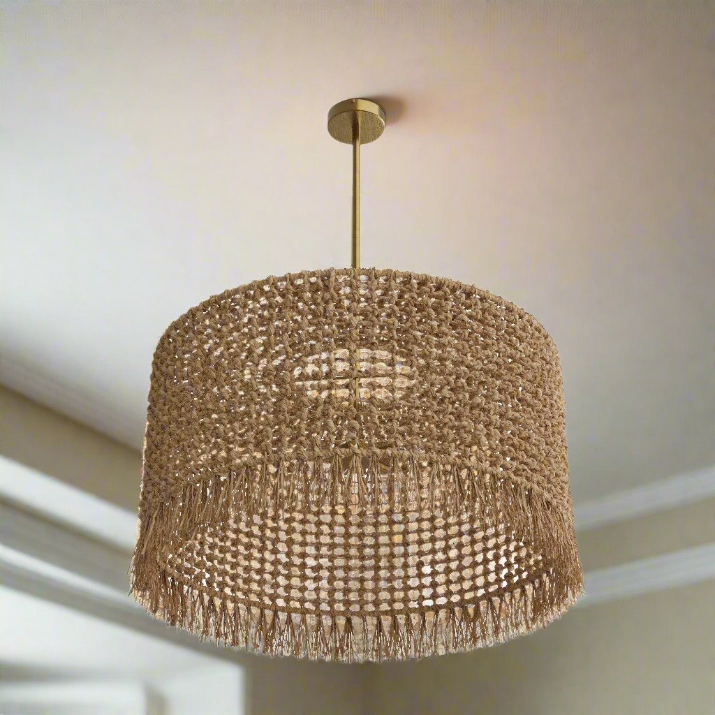 The Amari Chandelier in Natural Raffia from Arteriors Home was designed to enchant with patterns of light. Woven and knotted sustainable natural raffia is formed into a circular basket, to craft this intriguing design. Knotted and fringed at the edge for a festive finish, suspended by a pipe finished in antique brass iron. Finish will vary.