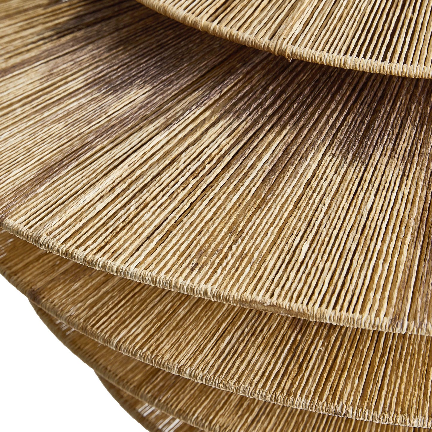 The Andria Pendant in Natural Raffia from Arteriors Home boasts shallow cones of natural and tobacco-stained raffia arranged in varying shades for a striking appearance. This environmentally-friendly piece is suspended by an antiqued brass finished support, while a lantern-style cotton under-shade emits a gentle radiance.