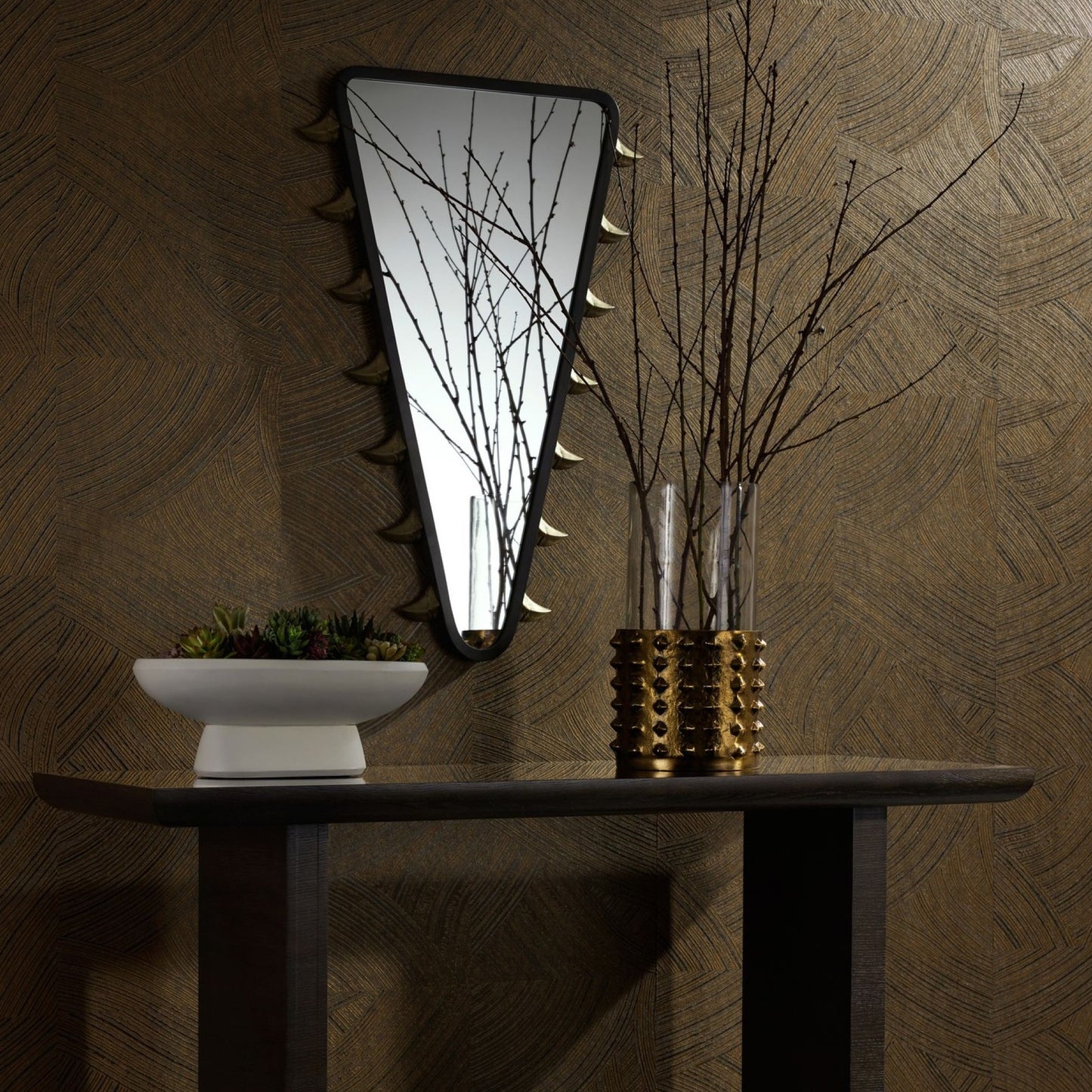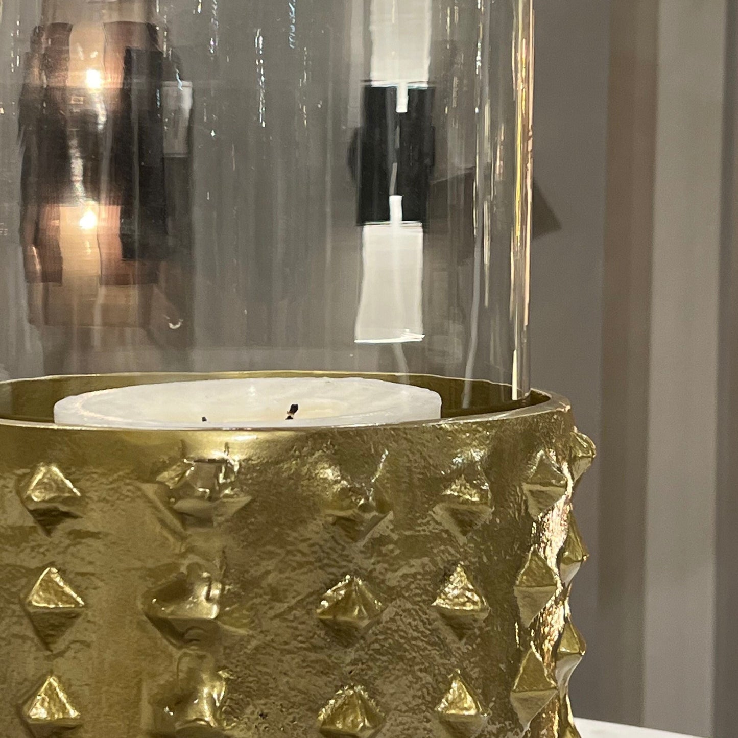 Reminiscent of ancient armor, the Ares Hurricane in Antique Brass from Arteriors Home is a marriage of materials and aesthetics. A bold and textural cast aluminum brass finished base sets off a clear container of glass designed to hold a pillar candle.