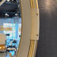 The Asmara Mirror in Ivory Leather with Brass from Arteriors Home features a classic round beveled glass and antique brass bullnose for a refined look. The ivory leather and brass bolt detailing adds captivating elements to the design, while the security cleat allows for effortless vertical hanging.