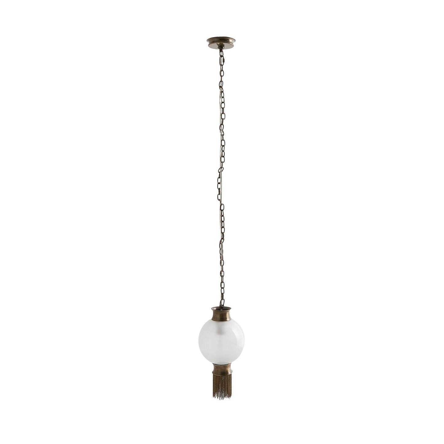 Art Deco lines are updated for a modern ear result in the chic Bowsell Pedant in Antique Brass Chain from Arteriors Home. Finished with a flourish of antique brass jewelry chain fringe, a frosted glass globe is suspended from a substantial iron chain finished in antique brass.
