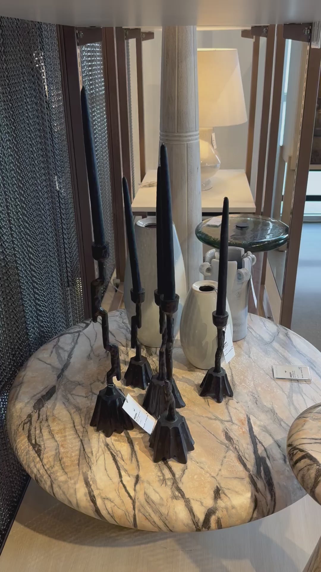 The Arteriors Home Brandt Candlestick Set is made of cast aluminum with a bronze finish, these organically-inspired accents vary in height to create visual interest. Each one has a fluted base and can hold a taper candle.