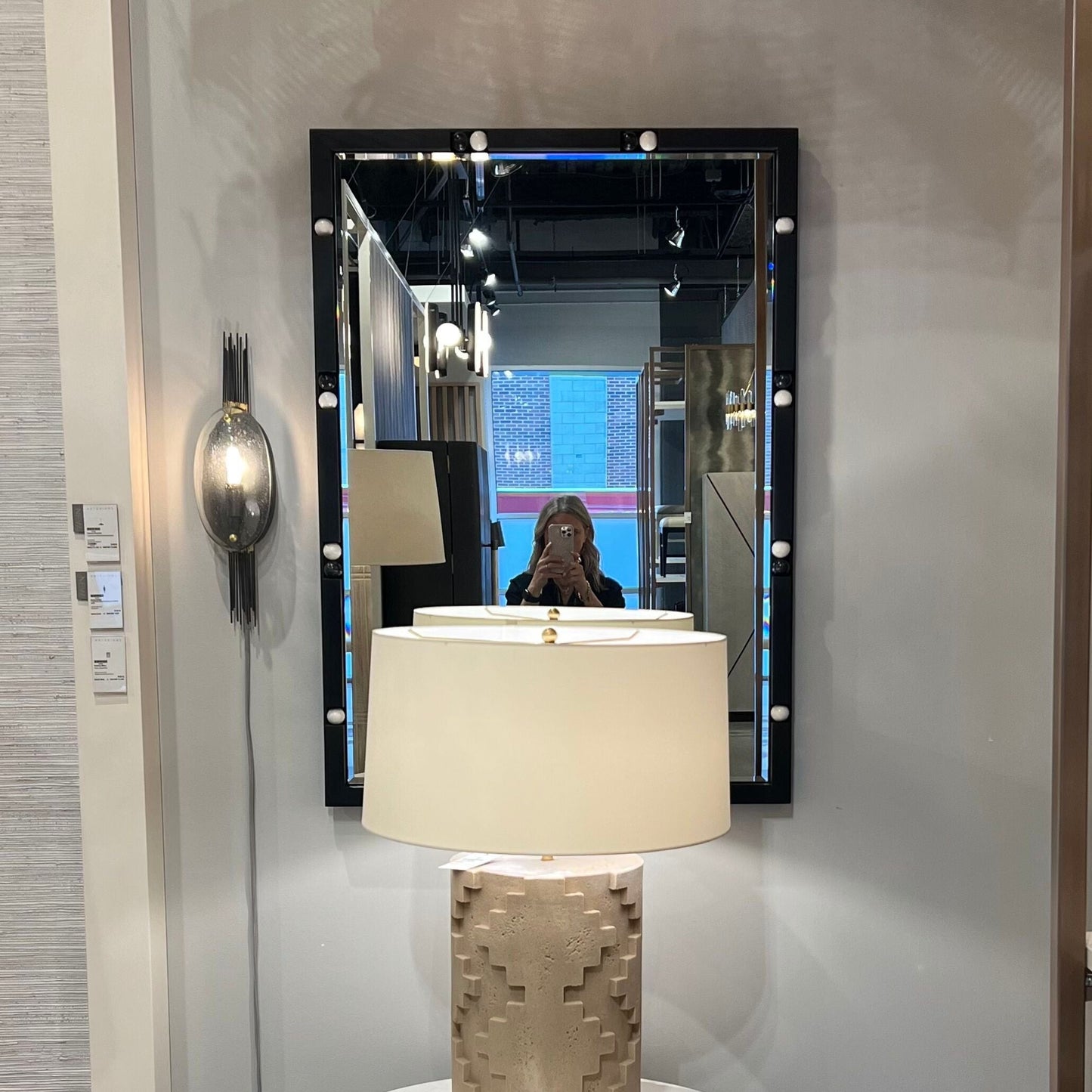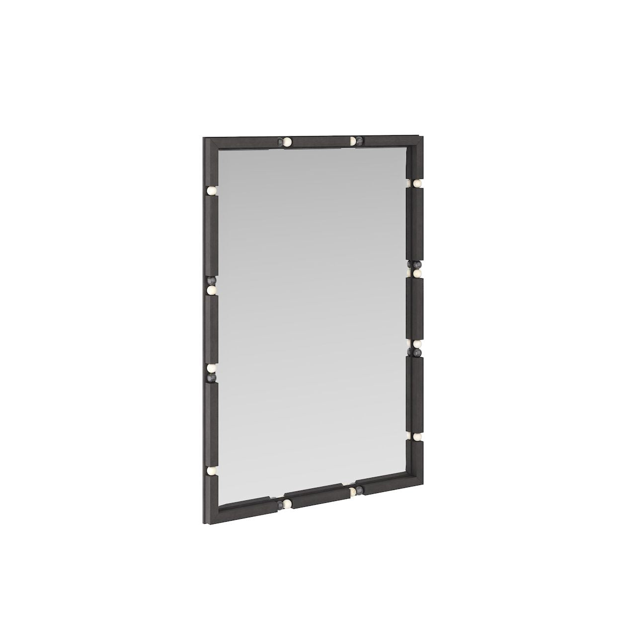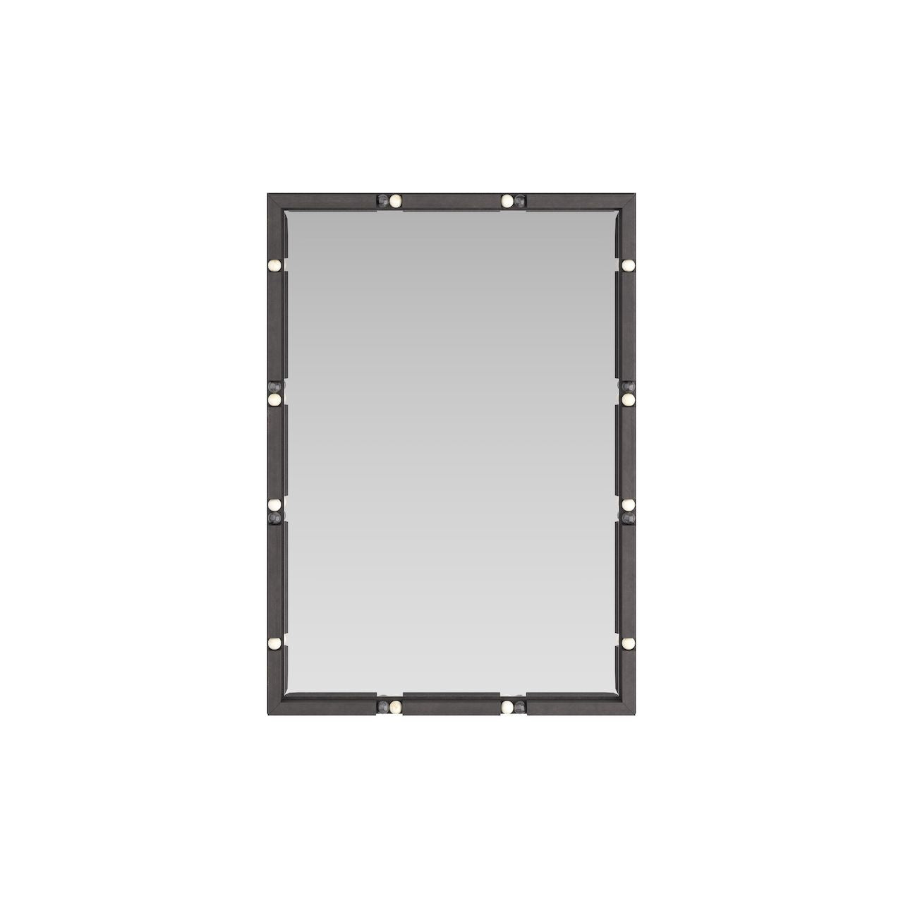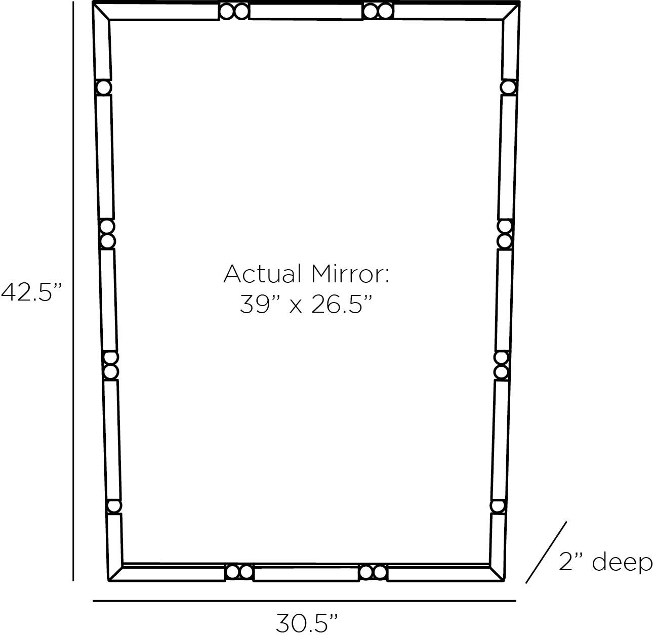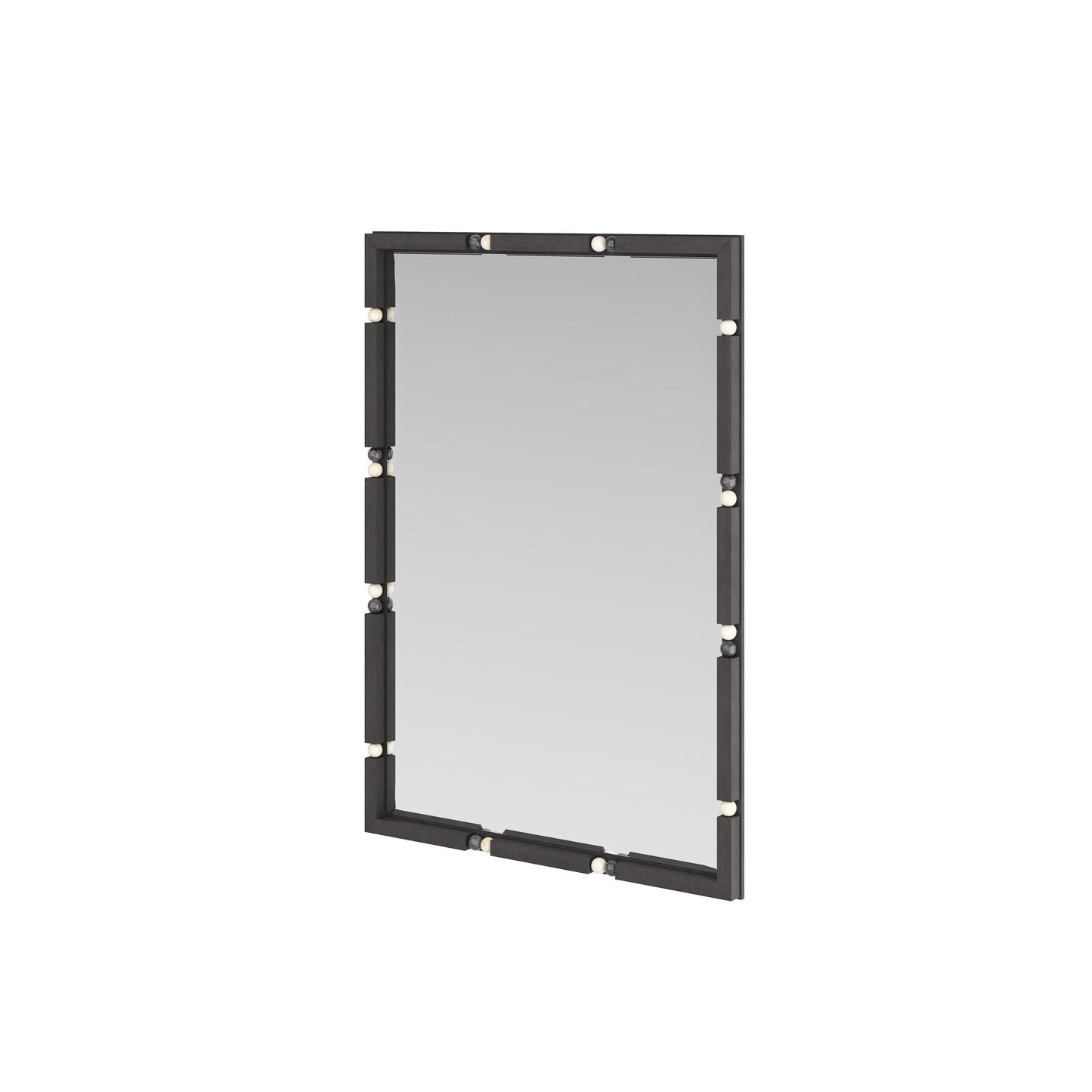 The Arteriors Home Brinkley Mirror showcases a rectangular frame crafted from ebony-finished mango wood, accented with marble balls in complementary shades. The contrasting black and white elements create a playful geometric look that enhances the understated design.