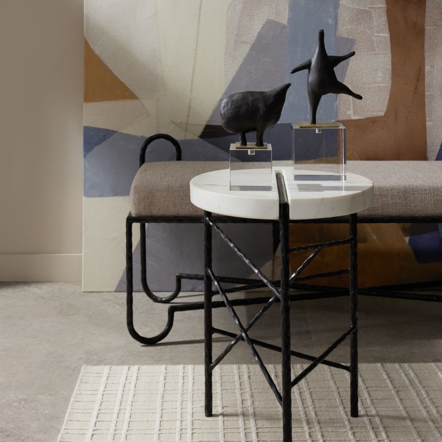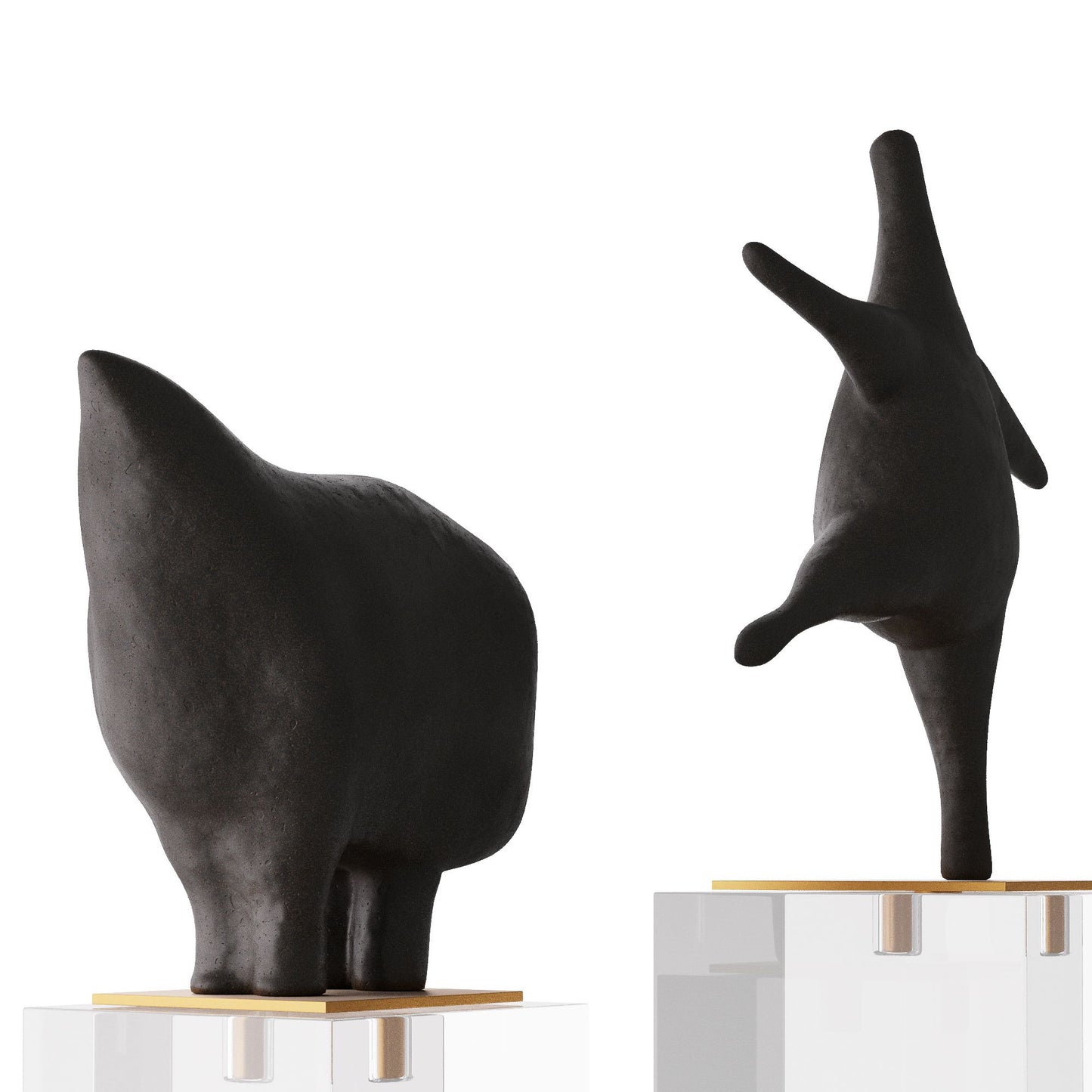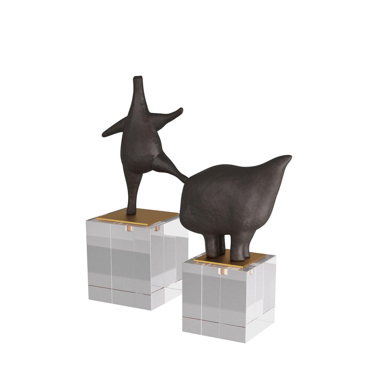 The Brovina Sculptures Set of 2 in Riverstone from Arteriors Home features abstract animals that frolic atop bases of antique brass steel mounted on clear crystal cubes. Skillfully carved of black riverstone, this modernist duo adds a touch of whimsy to any space.