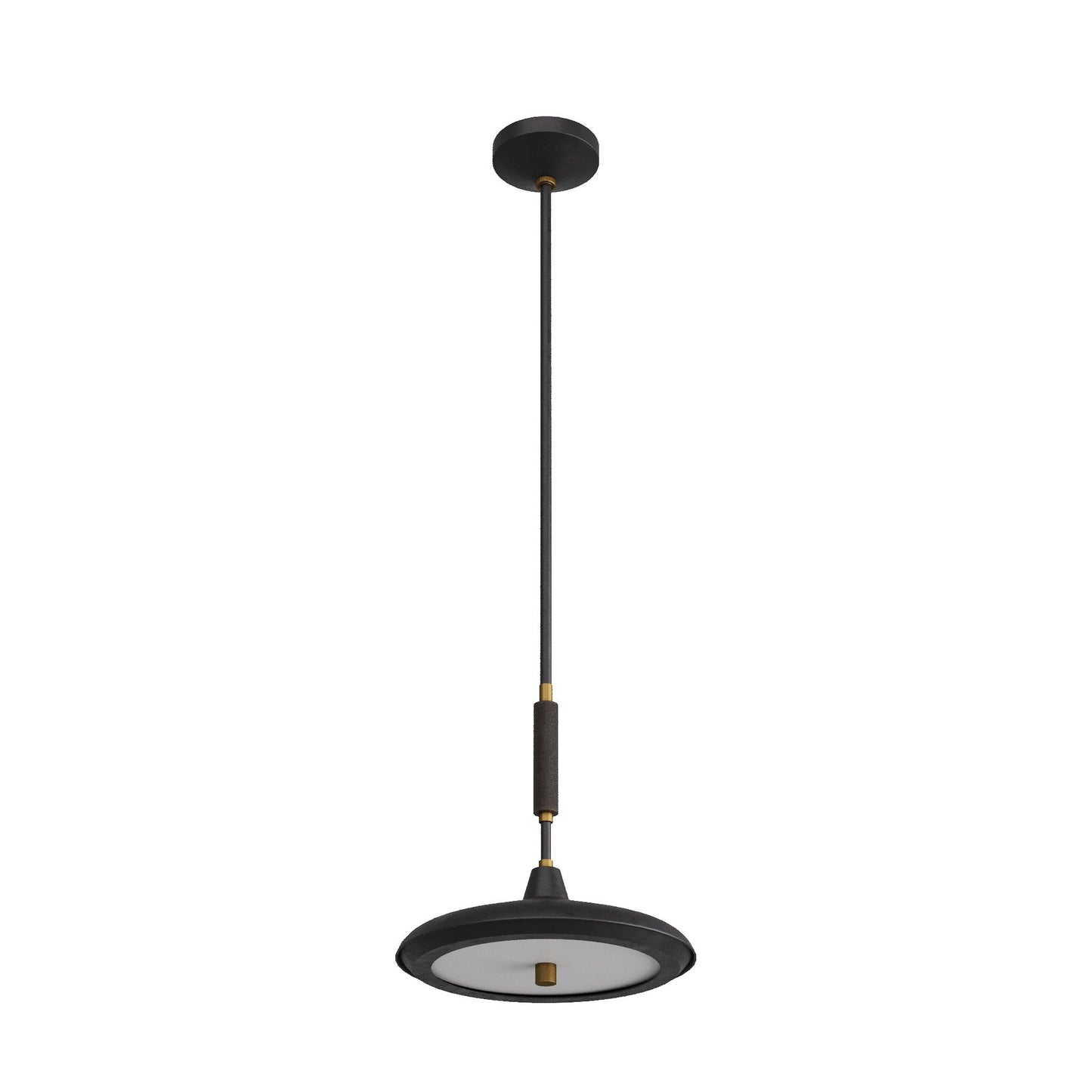 The Bryson Pendant in English Bronze and Acrylic from Arteriors Home features a sophisticated flat shade and a frosted acrylic diffuser, concealing an integrated LED for a sleek and industrial aesthetic. This pendant is accented with antique brass details.