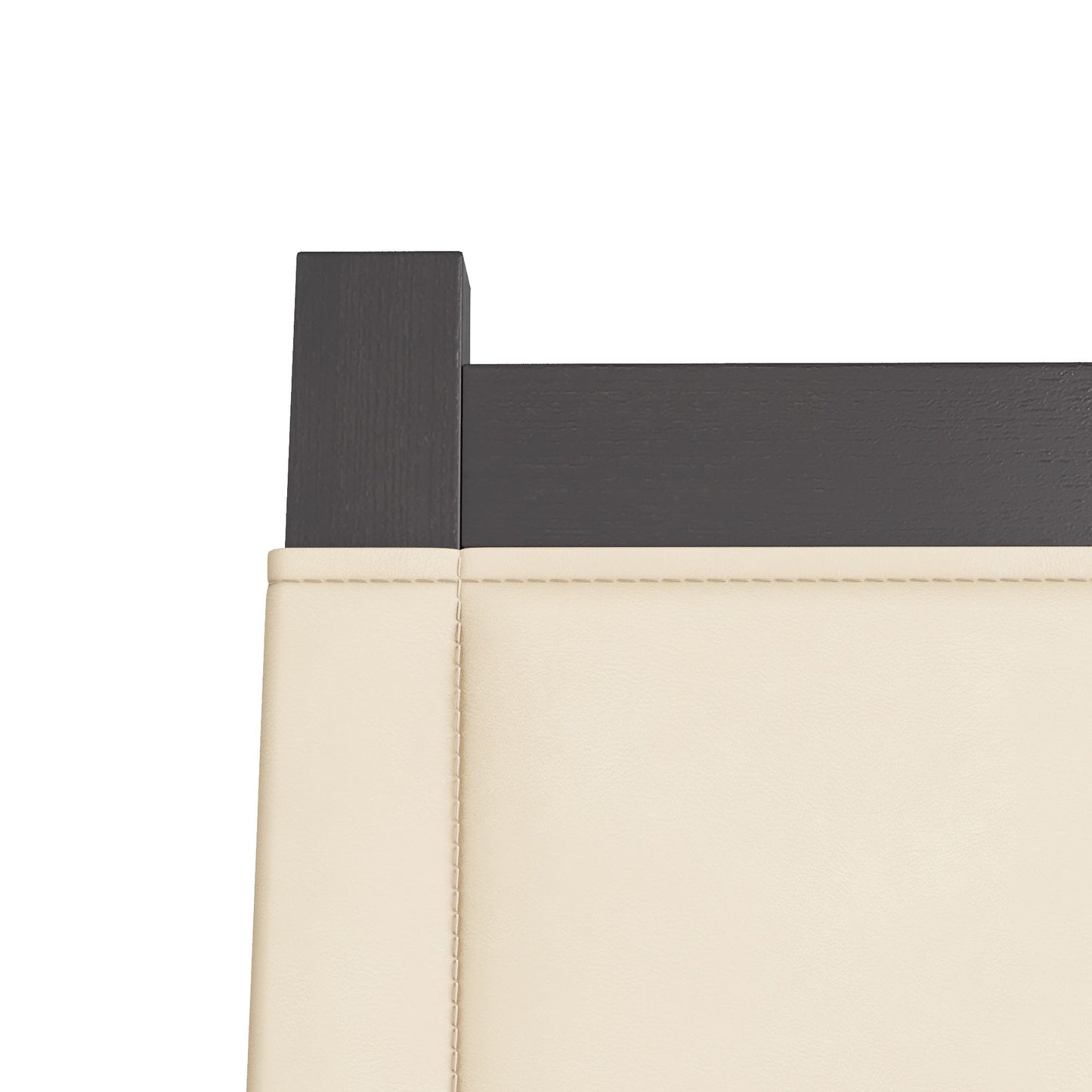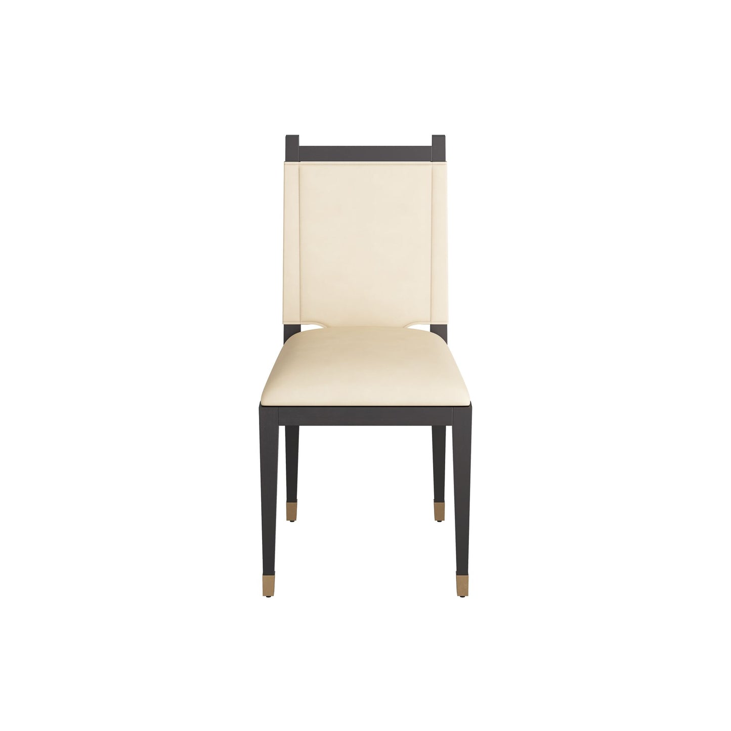 Crafted of luxurious ivory leather and ebony-finished beechwood, the Burdock Dining Chair in Ivory Leather from Arteriors Home possesses a crisp, geometric silhouette. A t-shaped sling-back balances the impeccably upholstered seat, providing comfort and support. Each square leg is capped in antique brass sabots.