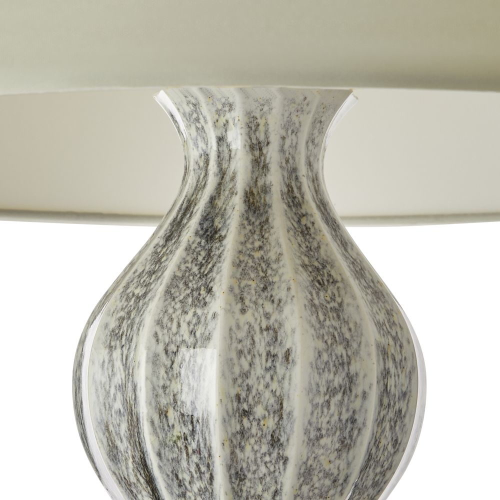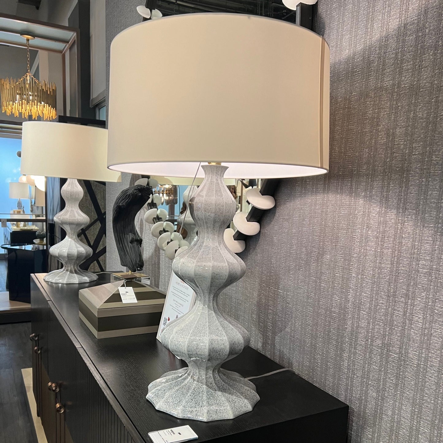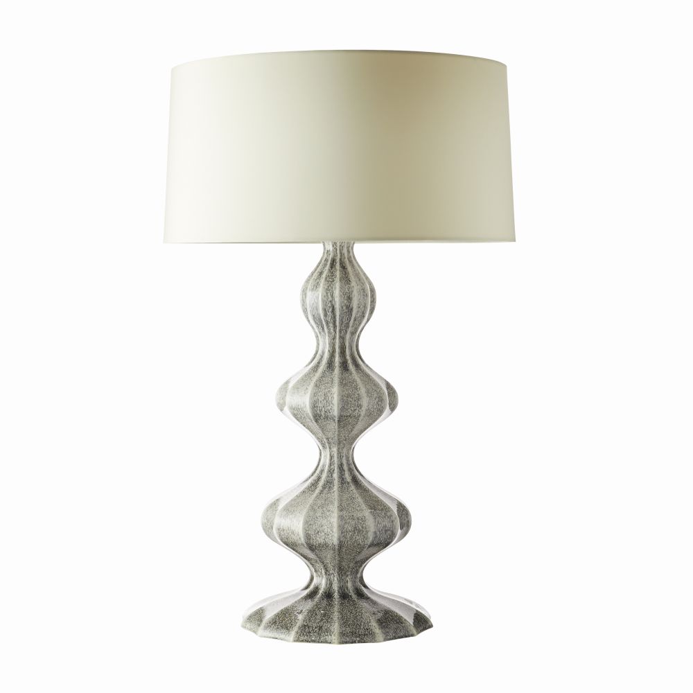Like flowing waves, the lines of the Chelle Lamp in Porcelain Glaze from Arteriors Home lamp are enhanced by an ice reactive glaze. Mutable shades accent each refined ridge at its pinch point. Topped with antique brass hardware and an oval shade of ivory microfiber.