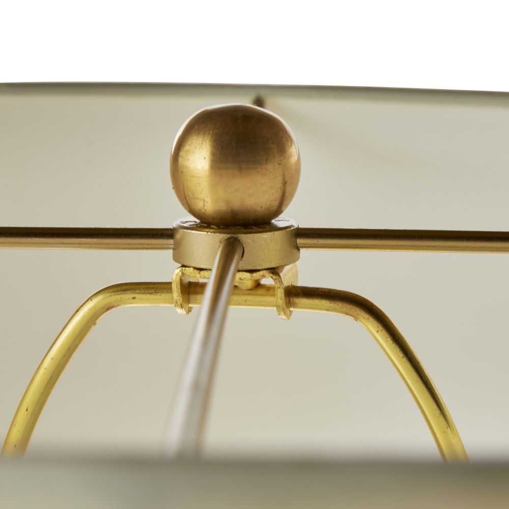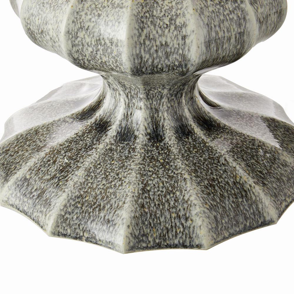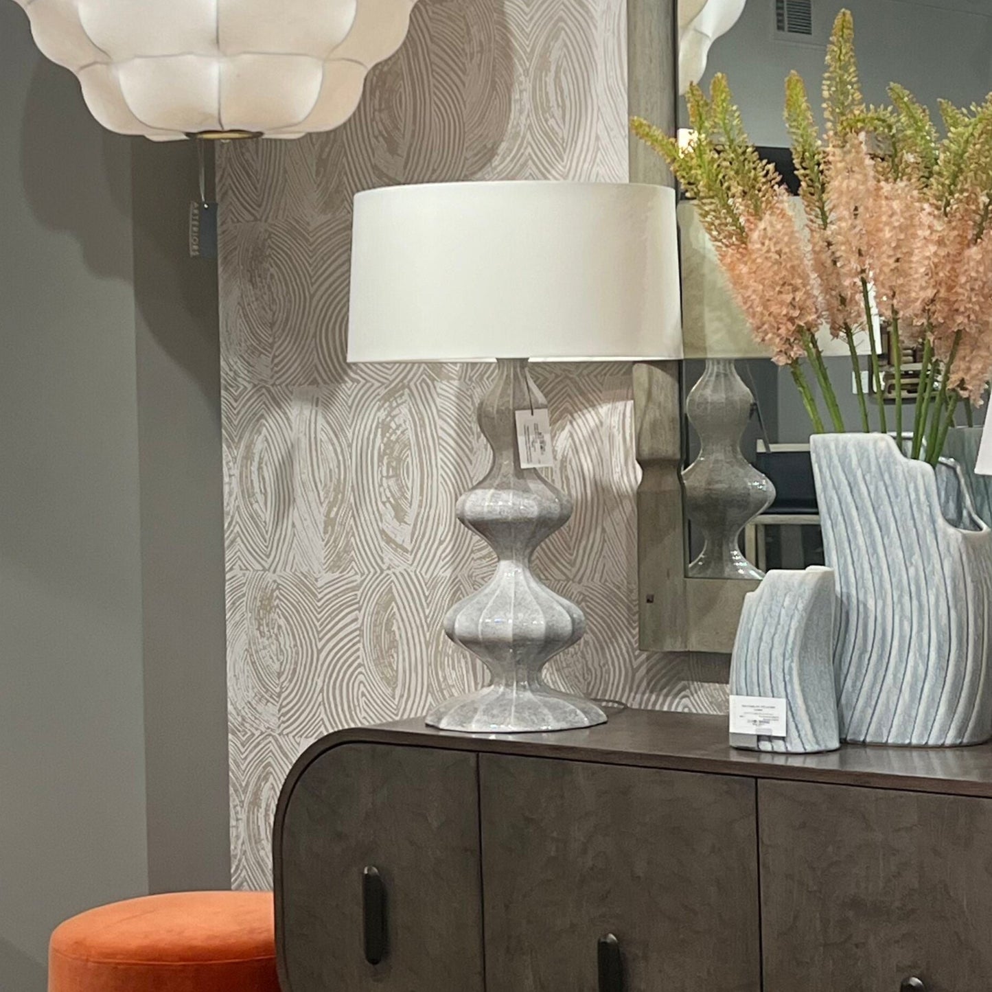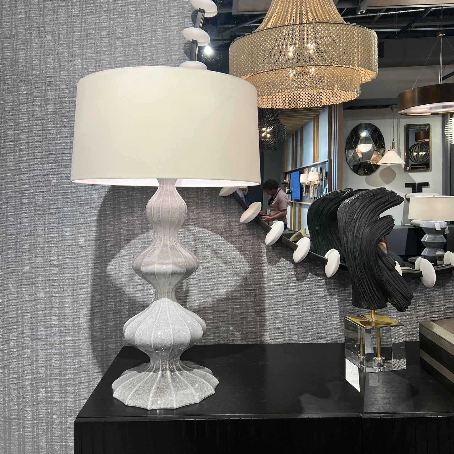 Like flowing waves, the lines of the Chelle Lamp in Porcelain Glaze from Arteriors Home lamp are enhanced by an ice reactive glaze. Mutable shades accent each refined ridge at its pinch point. Topped with antique brass hardware and an oval shade of ivory microfiber.