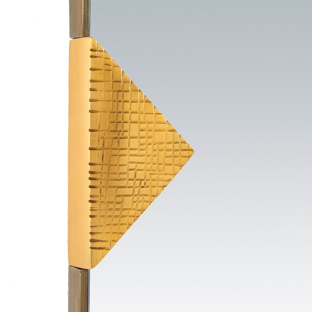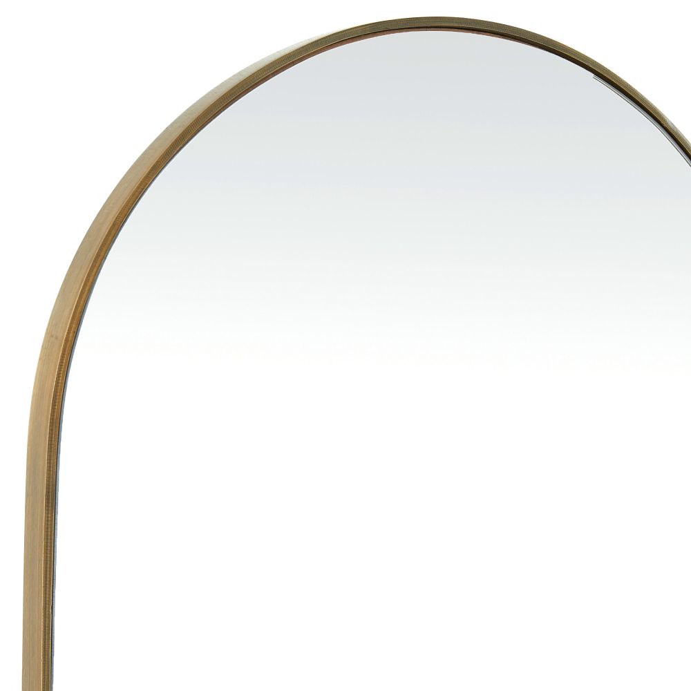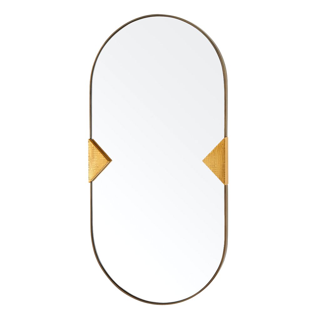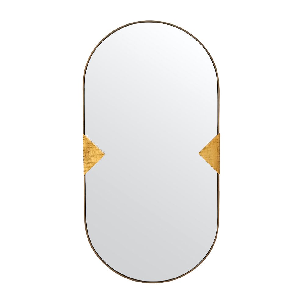 The Cillian Mirror in Antique Brass by Arteriors Home features a unique oval shape clasped with antique brass iron, reminiscent of a diamond ring setting. Its textured finish resembles forged armor and allows for horizontal or vertical hanging.