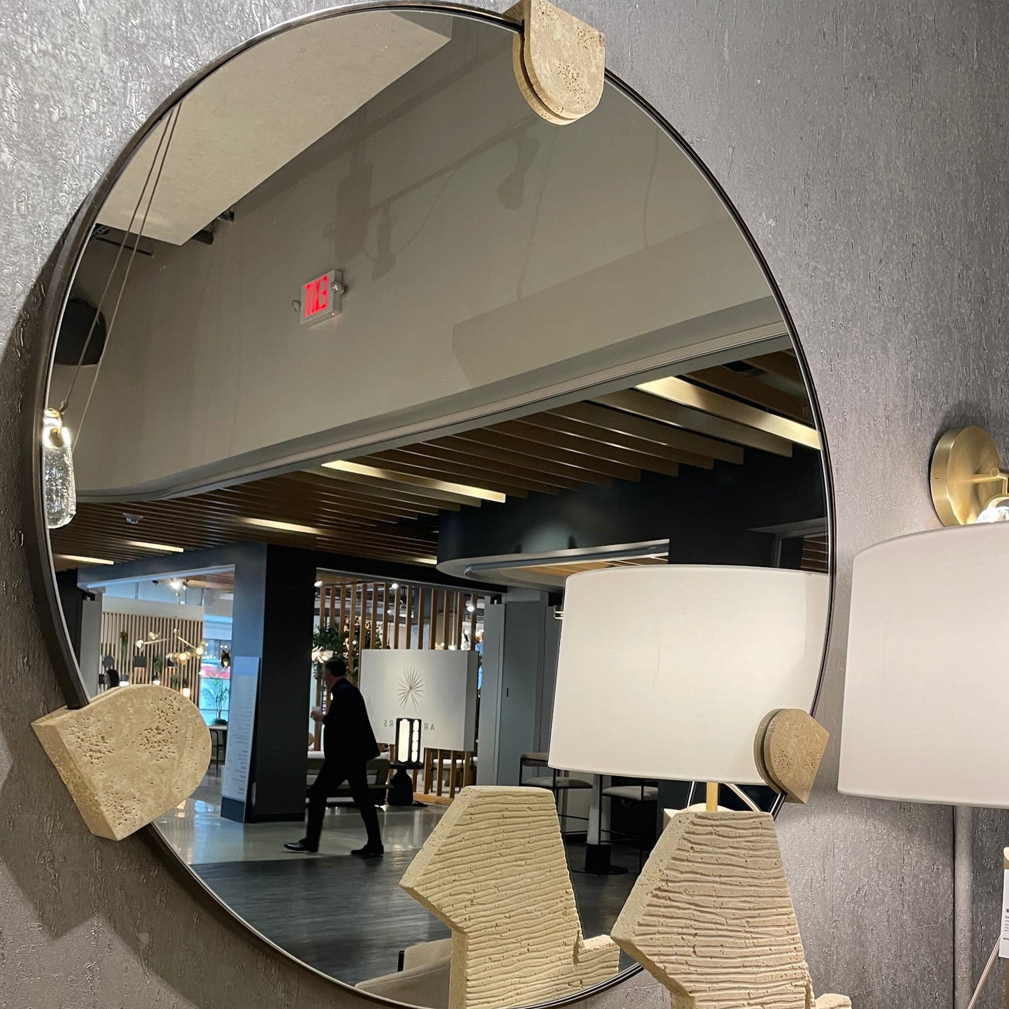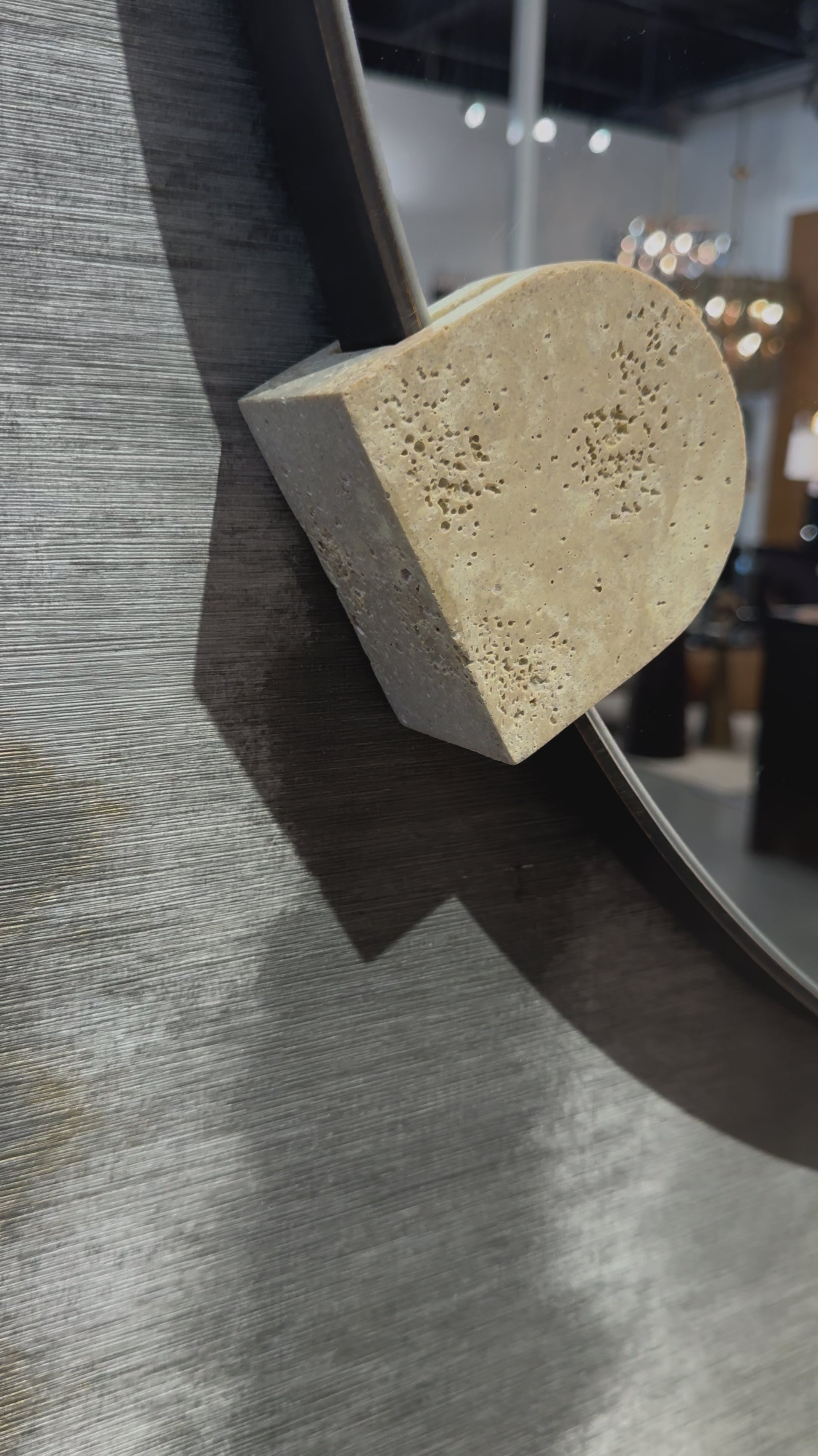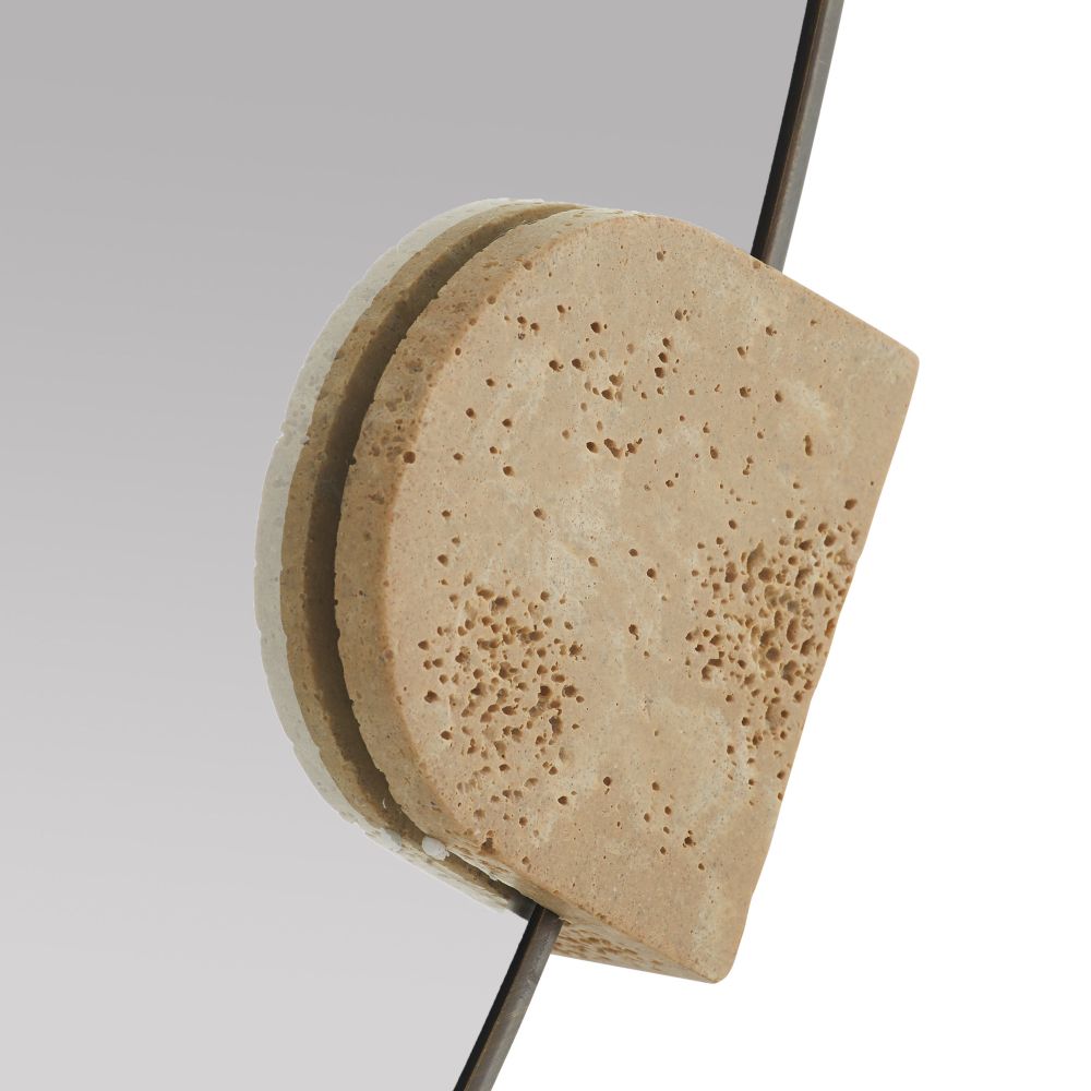 The Clasp Mirror Bronze by Arteriors Home incorporates three suspended faux travertine resin pieces to frame the mirror. The contrast between the warm, textured material and the smooth mirrored surface is enhanced by the bronze-plated steel frame.
