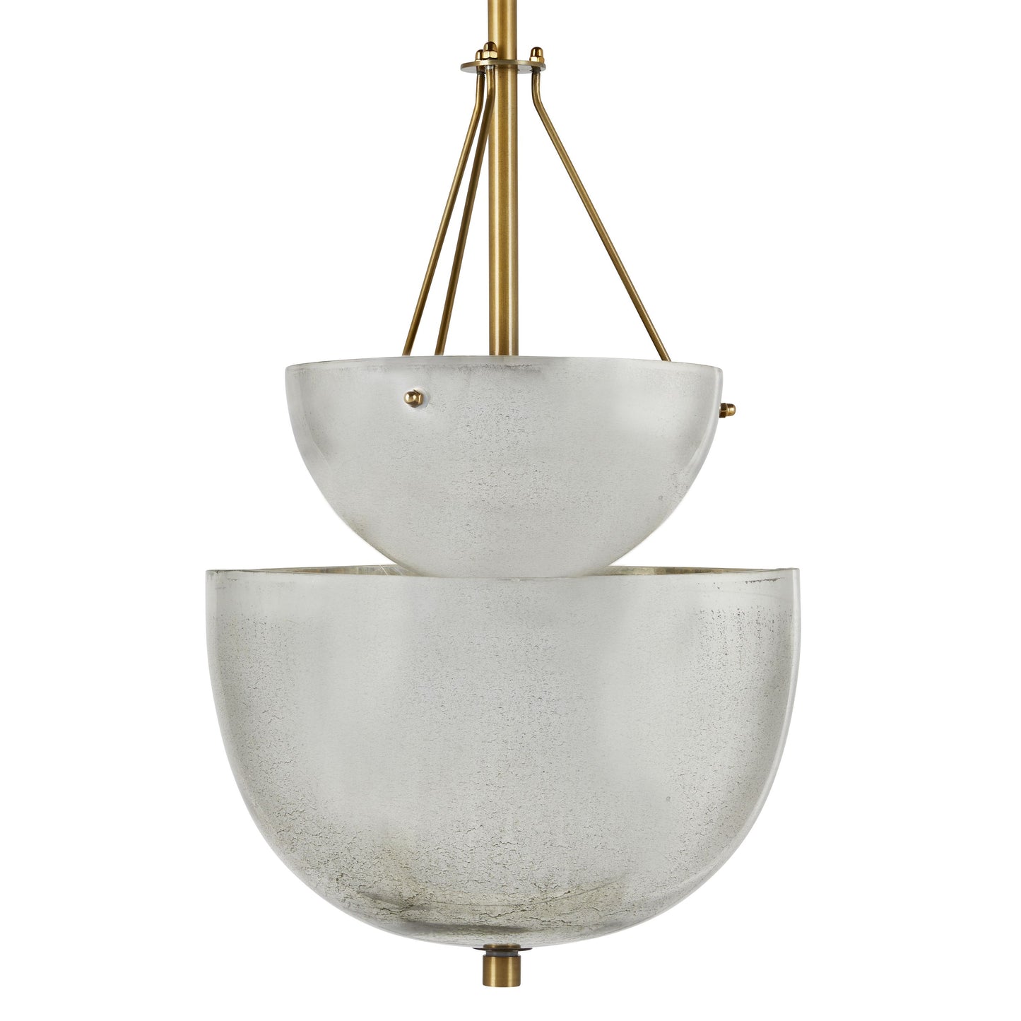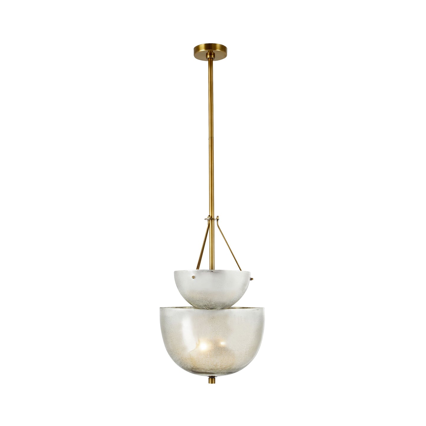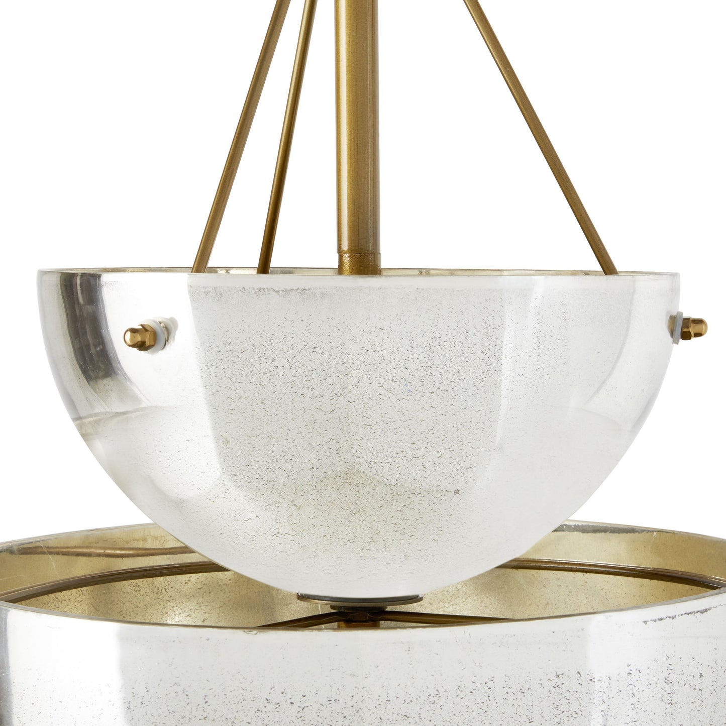 Tiers of antique mercury glass elevate the classic silhouette of the Colleen Chandelier in Antique Mercury Glass from Arteriors Home. The crackled surfaces deliver flattering up light with a shimmering mirrored effect from the dual shades. Antique brass-plated iron frame and canopy. Finish will vary.