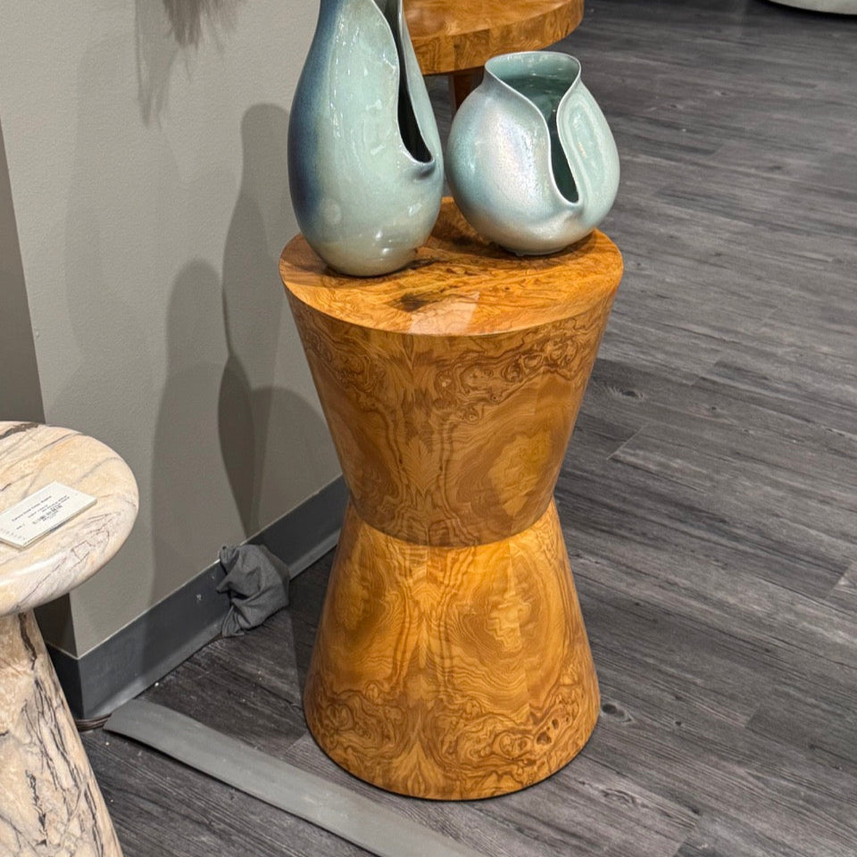 Simple forms meet glam materials in the Costello Accent Table in Blonde Burl from Arteriors Home. A tapered hourglass table is elevated in olive ash burl veneer, book-matched at the top and base for a soothing mirrored effect.