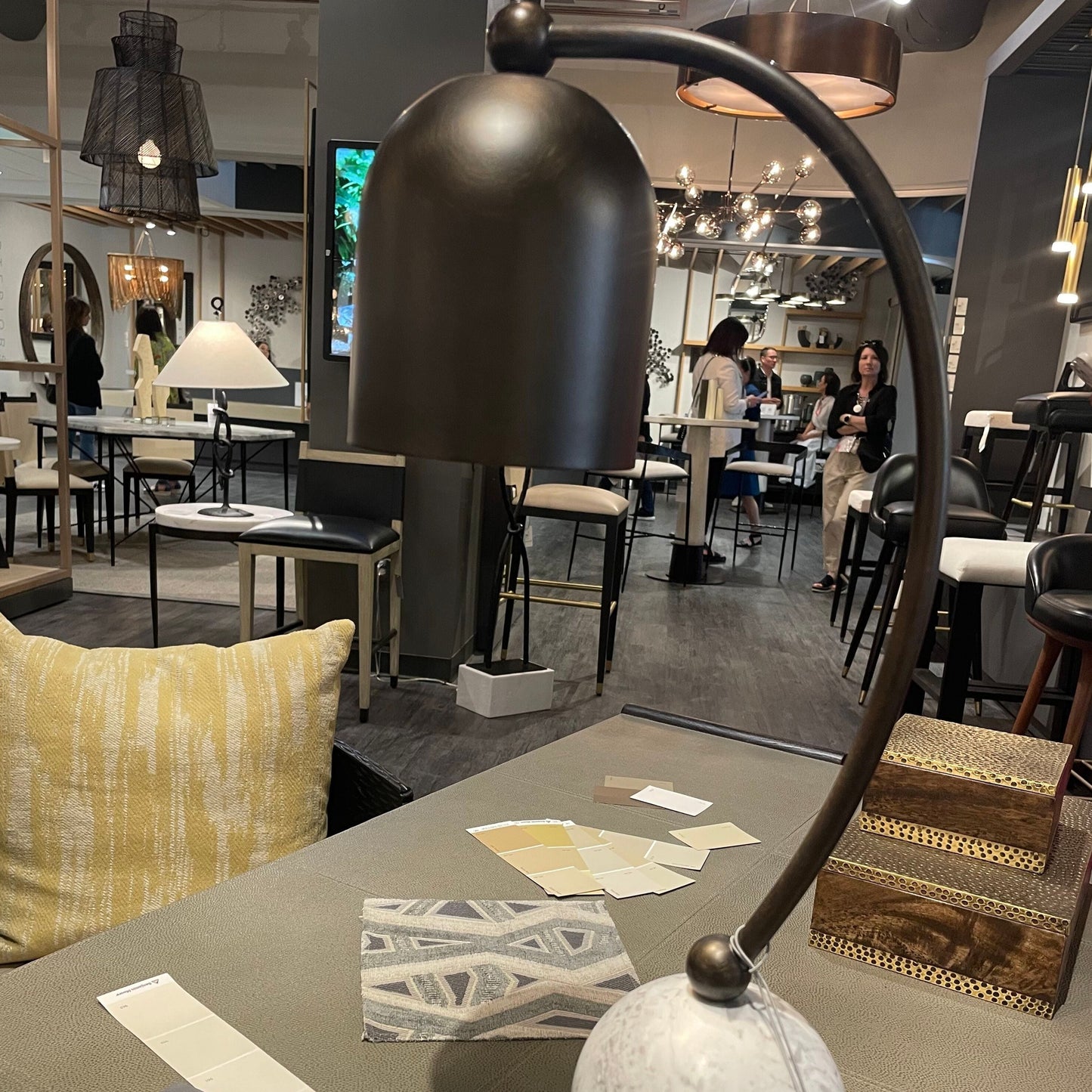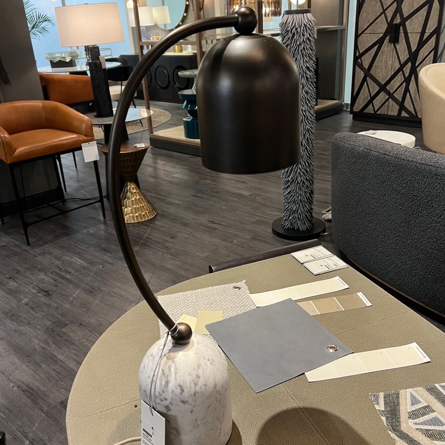 The stylish sculptural lines of the Daley Desk Lamp in Marble from Arteriors Home embody the classical forms of elemental geometry. a bell-shaped shade of english bronze plate finds its sculptural match in a gray flower marble base.