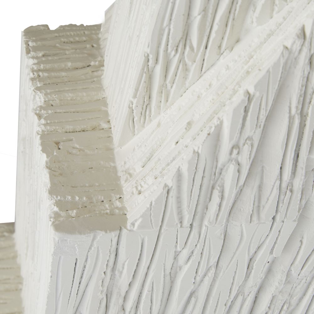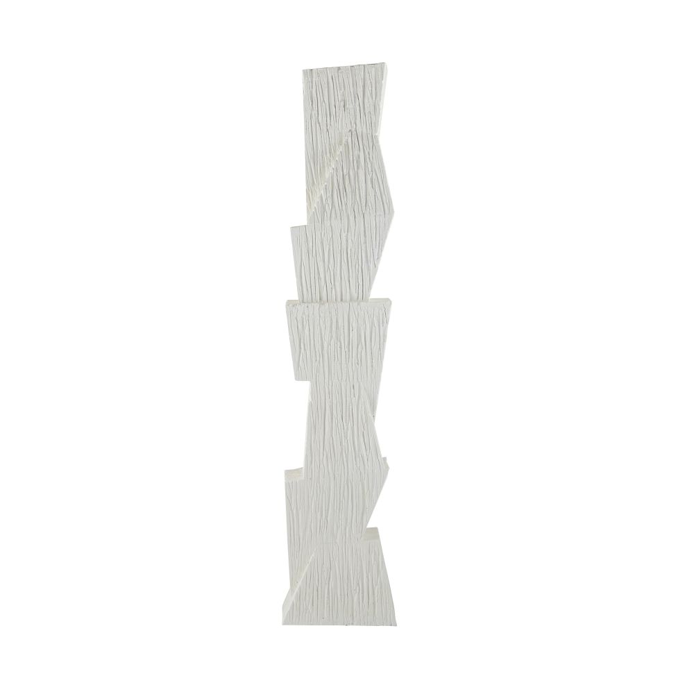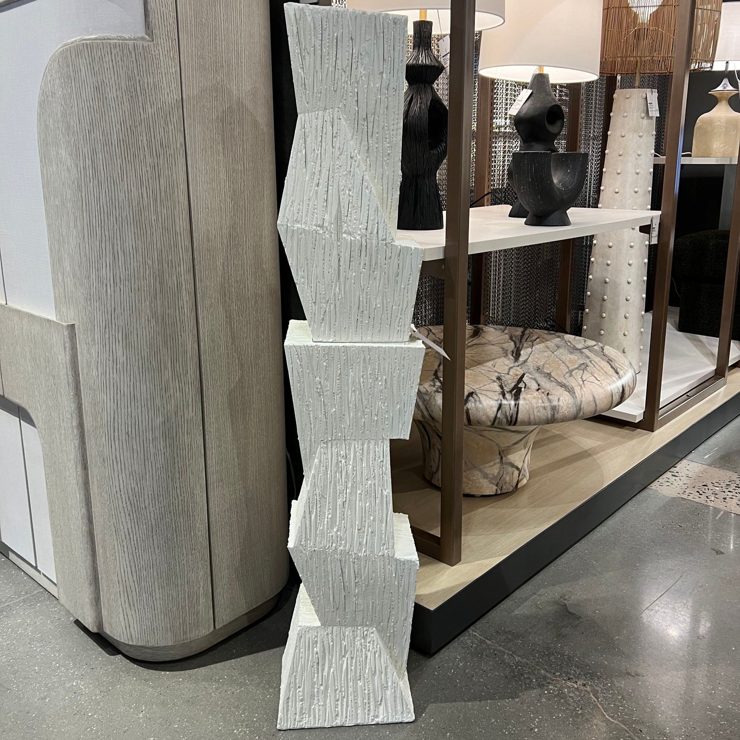 The Arteriors Home Darnell Floor Sculpture is crafted from matte white resin and boasts a striking geometric design. The faux wood finish adds texture to its vertical surface, making it a captivating centerpiece for any room.