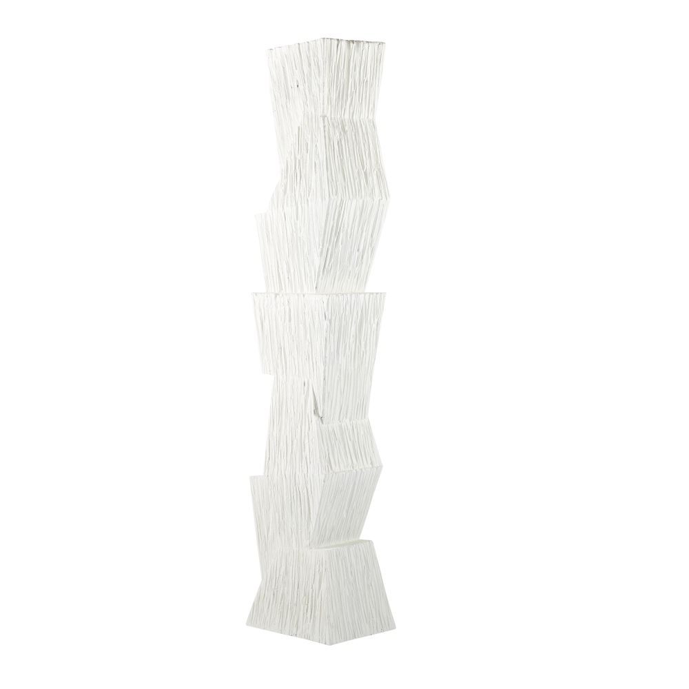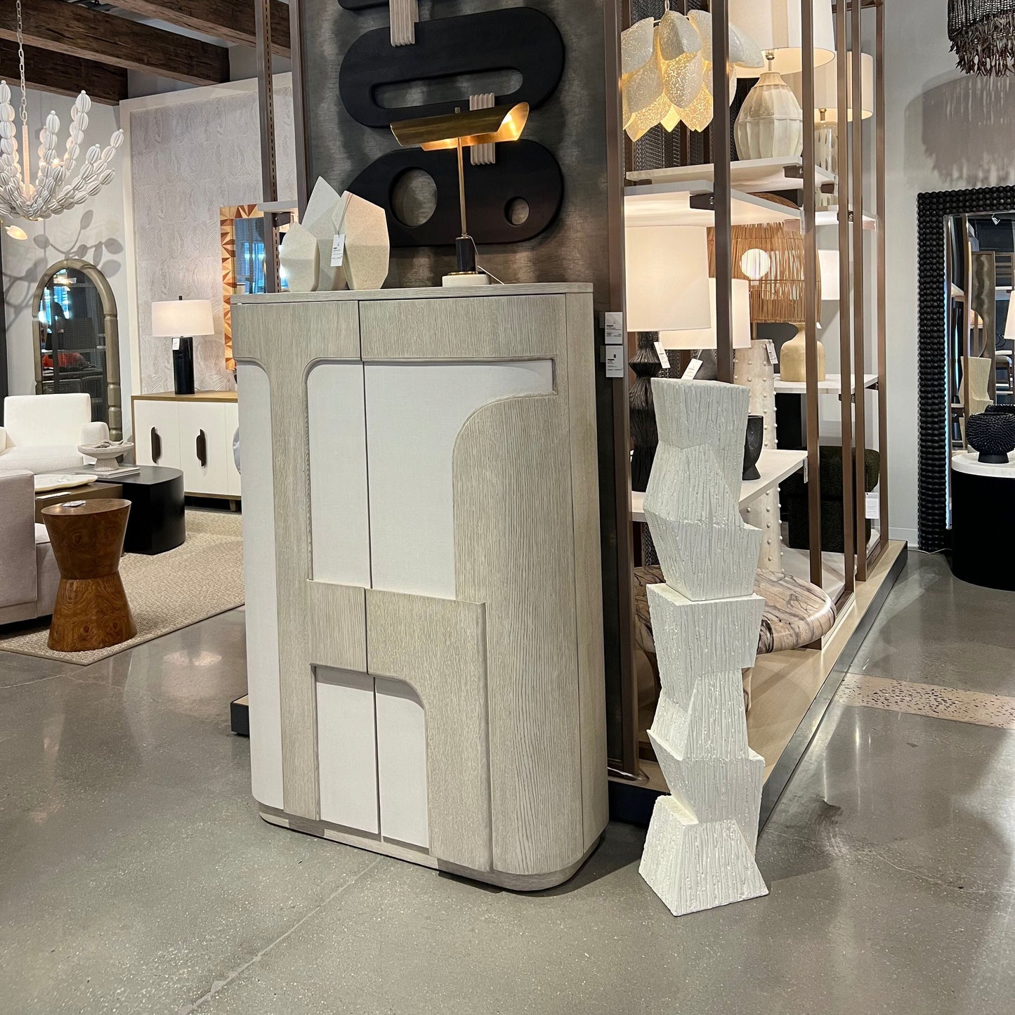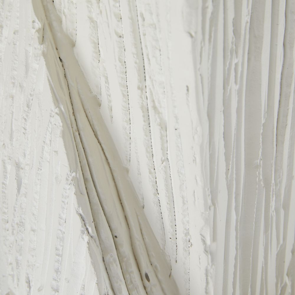 The Arteriors Home Darnell Floor Sculpture is crafted from matte white resin and boasts a striking geometric design. The faux wood finish adds texture to its vertical surface, making it a captivating centerpiece for any room.
