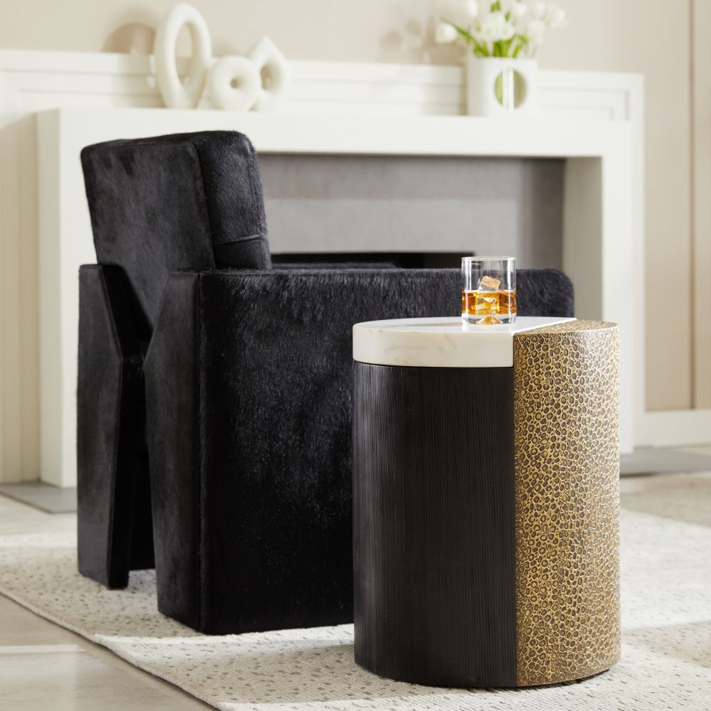 Bringing back the best of 1990s-influenced style, the handsome Devine Lounge Chair in Black Hair on Hide from Arteriors Home was designed to please from every angle in a room. As attractive from the back as when seen head on, its precise lines are enhanced with a cinched hourglass back. Squared arms and a well-padded seat complete the silhouette.