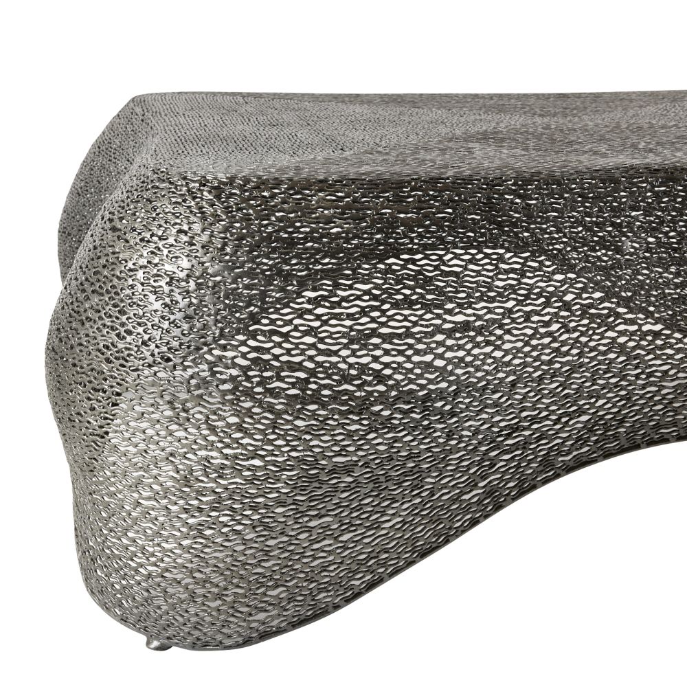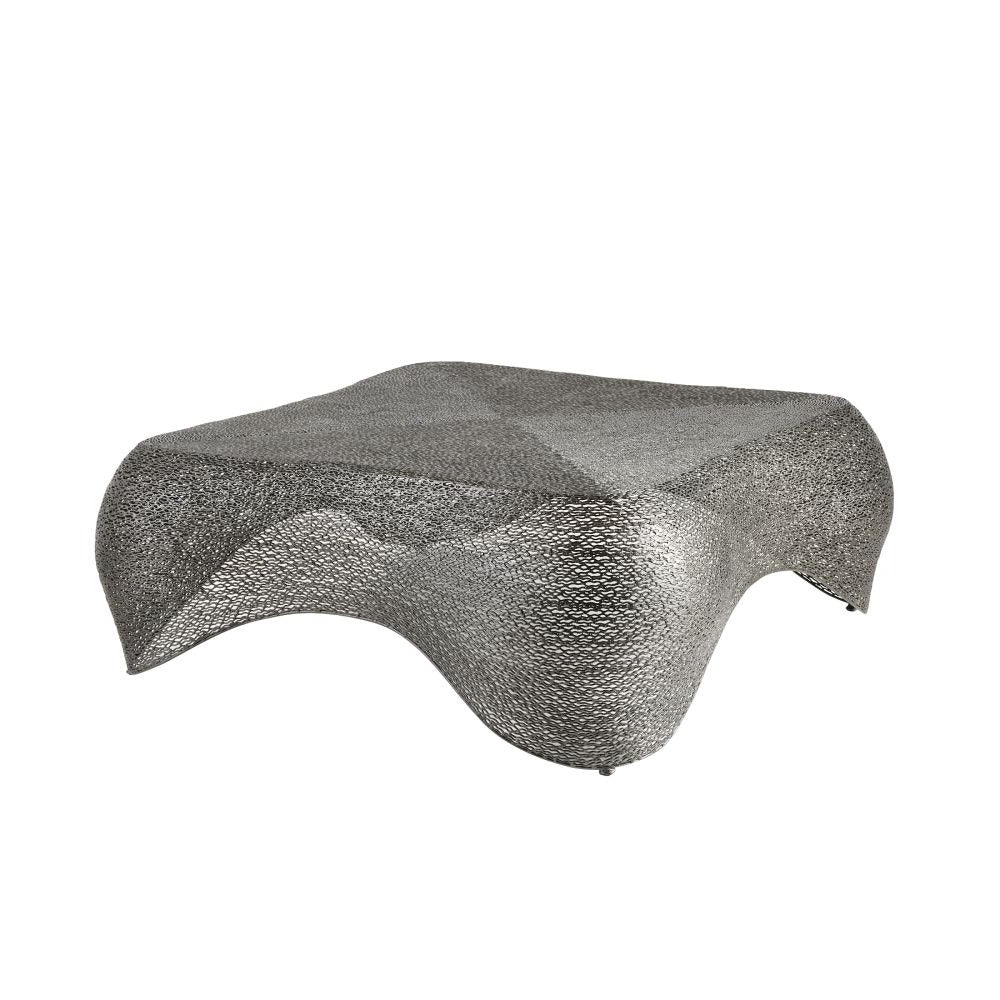Formed of galvanized iron in a graphite shade, the Dewalt Cocktail Table in Graphite Iron from Arteriors Home plays with transparency in an intriguing fashion. Designed to undulate around the entire structure, its webbed texture recalls the curves of a transparent jellyfish.