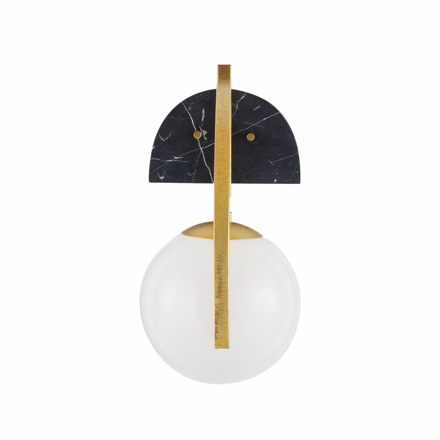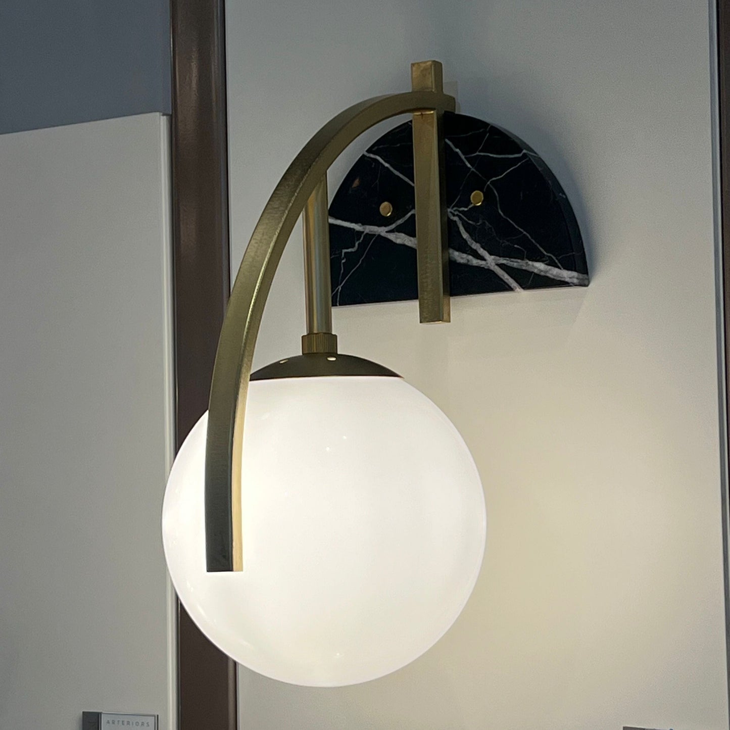 The deco-inspired Dipper Sconce in Black Marble from Arteriors Home balances a backplate of black marble with a singular frosted opal glass globe. Suspended by chattered antique plated steel hardware, the Dipper is an elegant addition when staged on either side of a mirror.