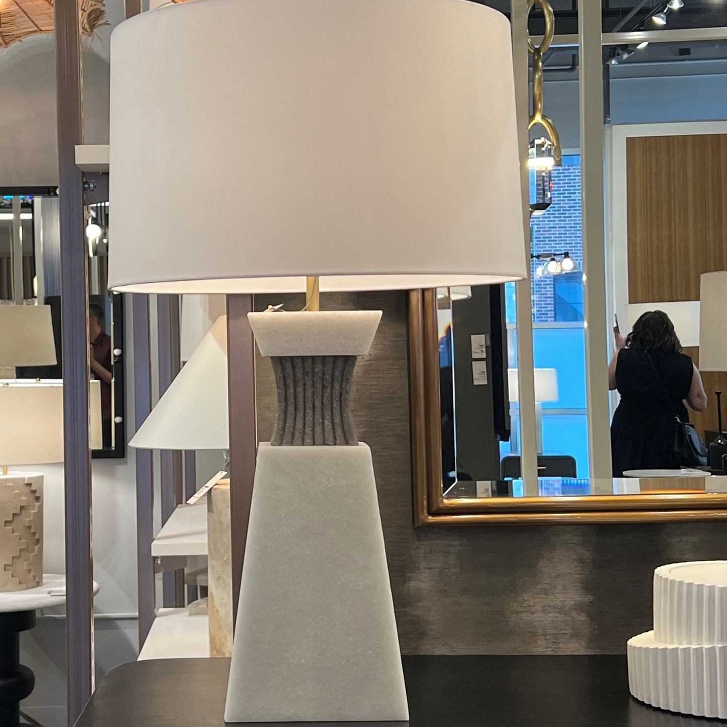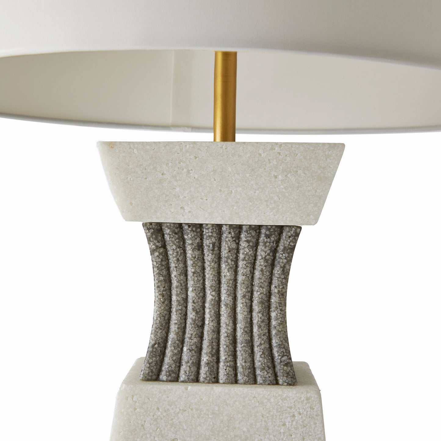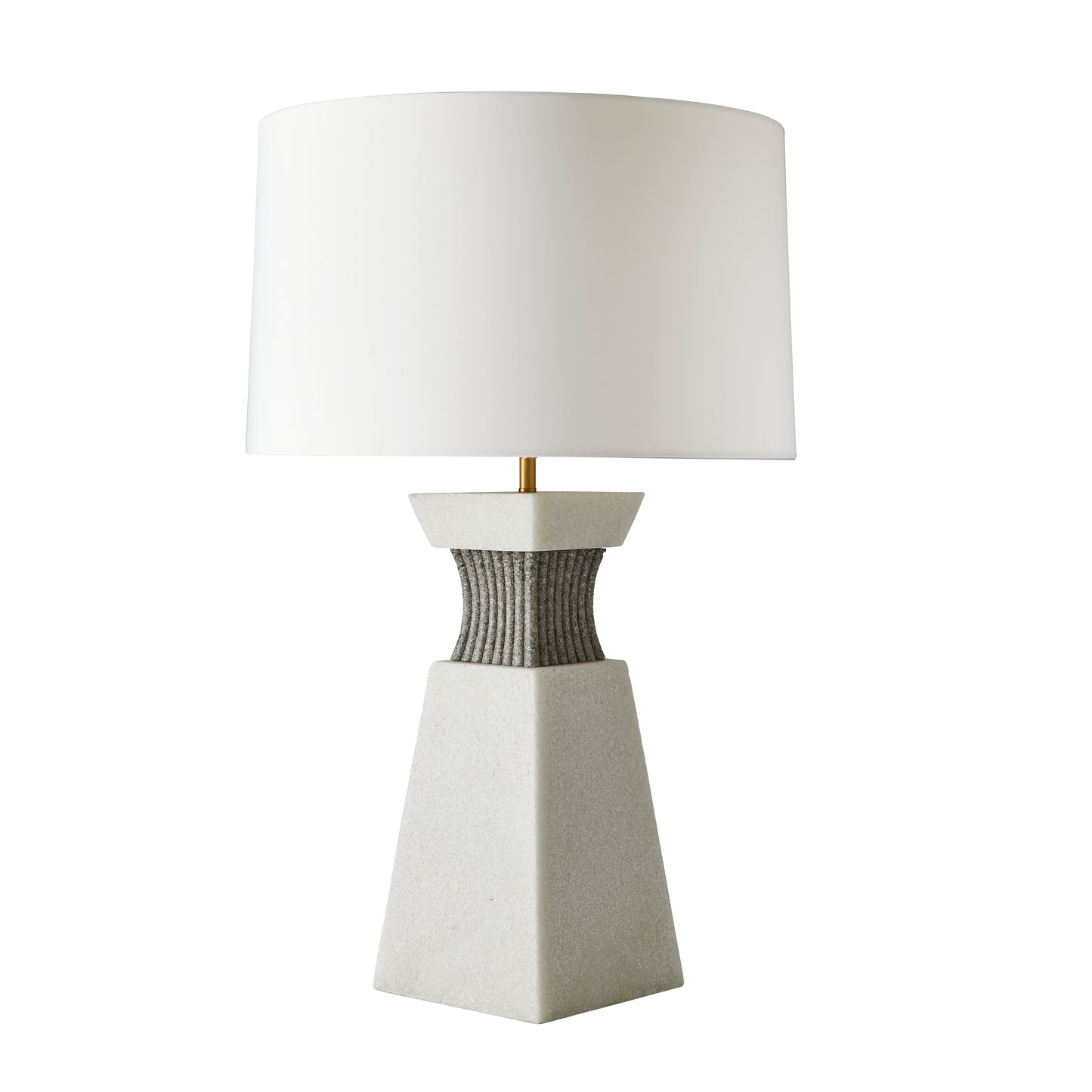 Classical in origin, the Dynasty Lamp in Graphite Gray from Arteriors Home resembles a greek pillar. Modernizing sacred geometry, a grooved inset of graphite grey contrasting stone accents the cinched silhouette.