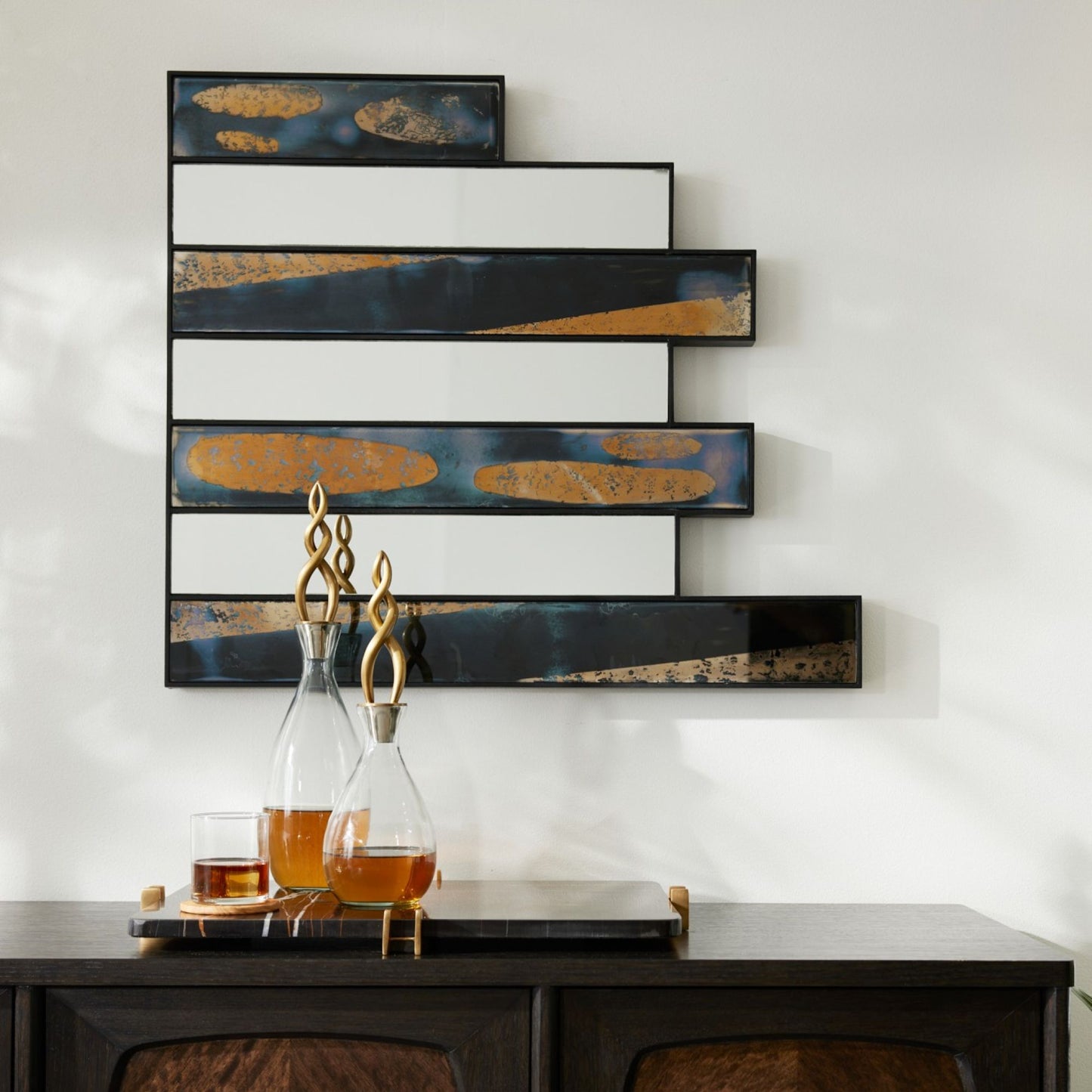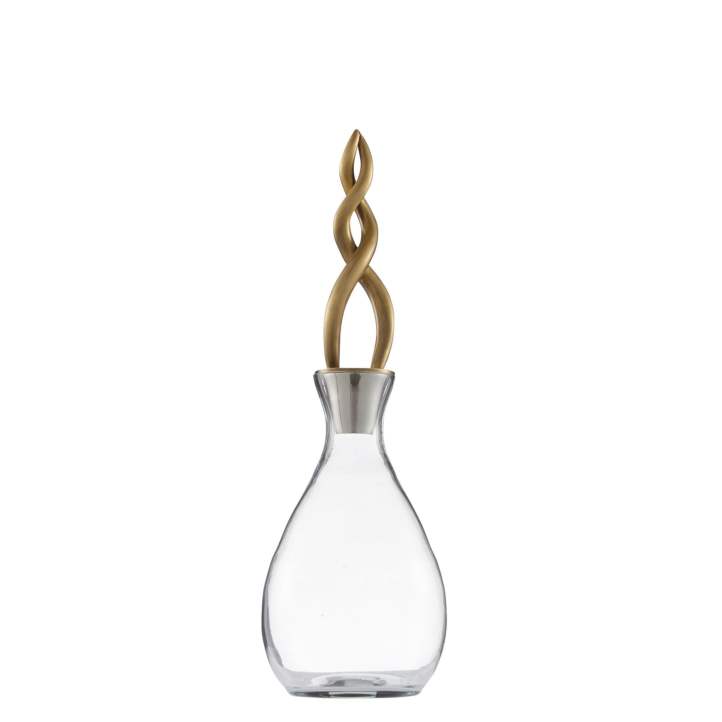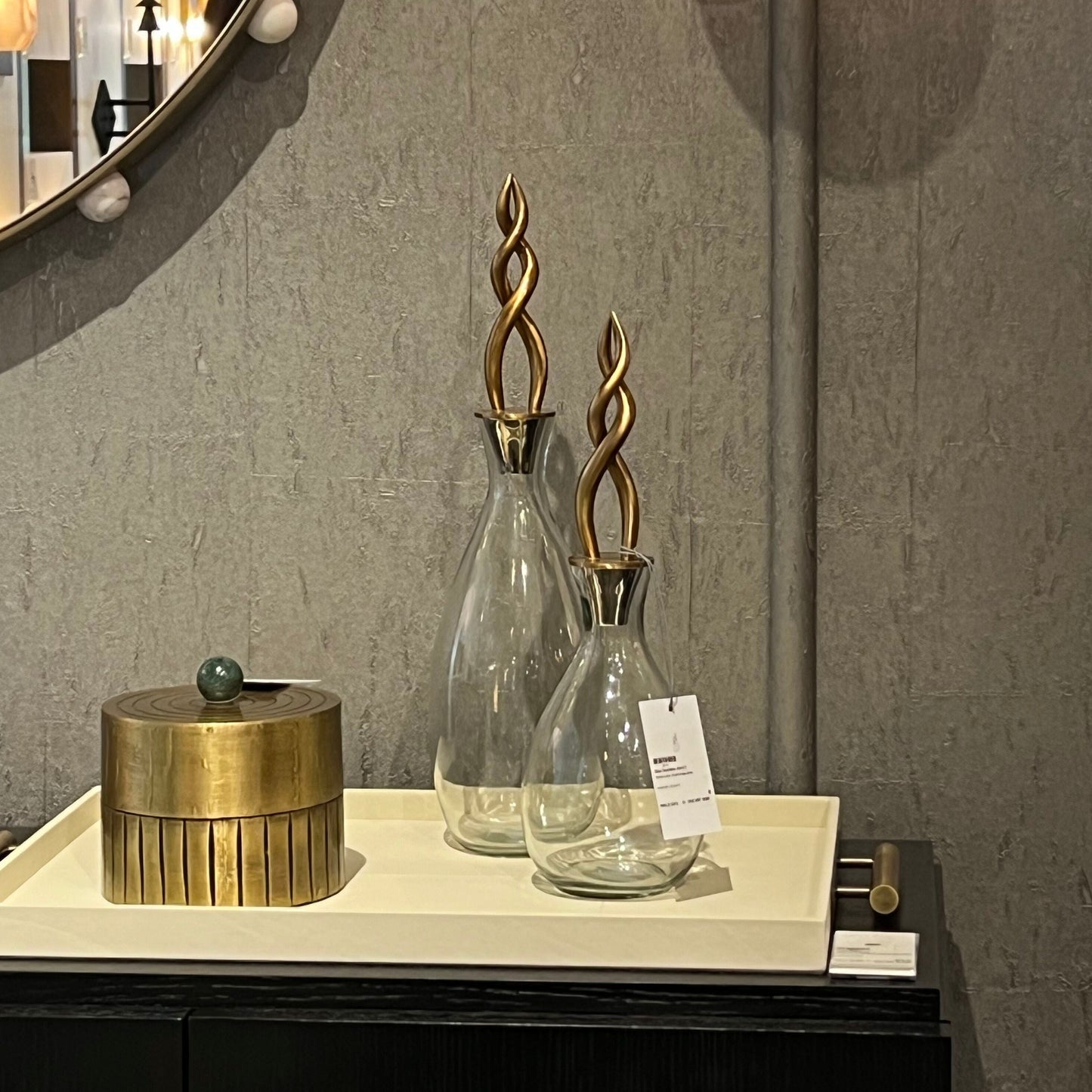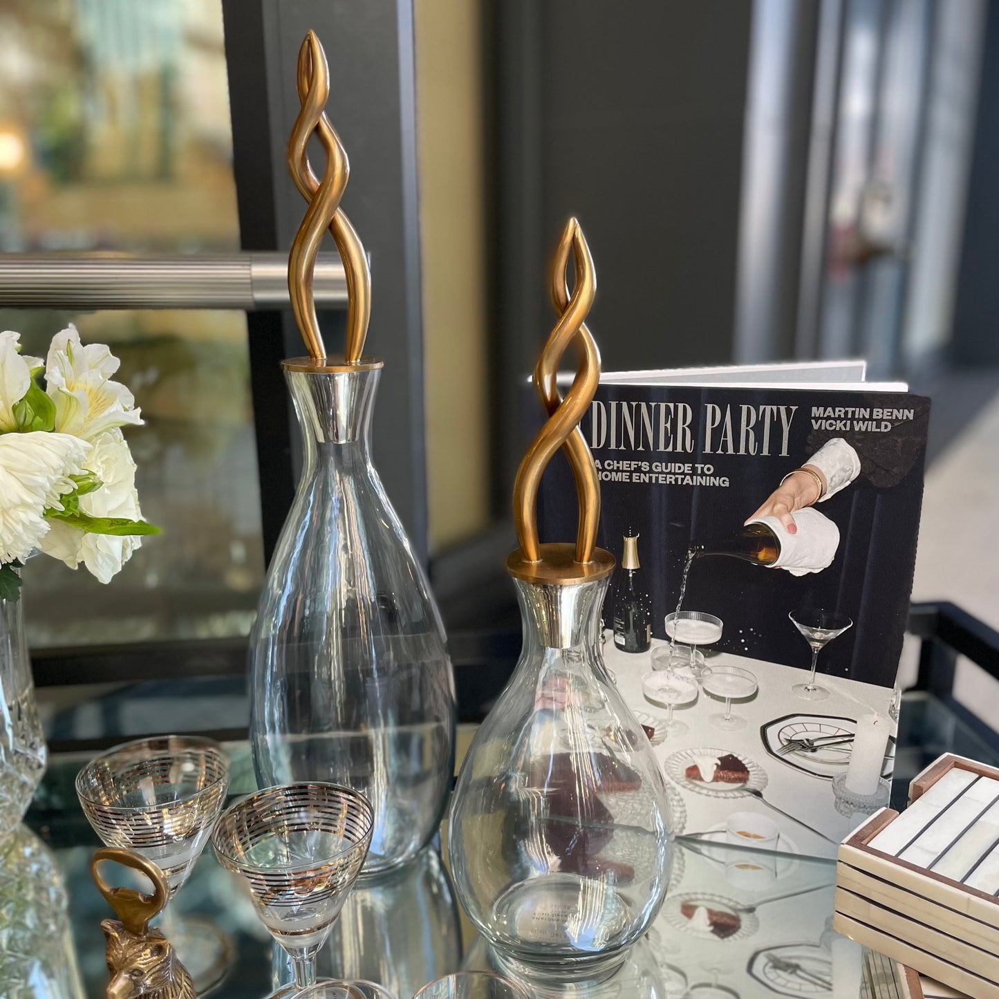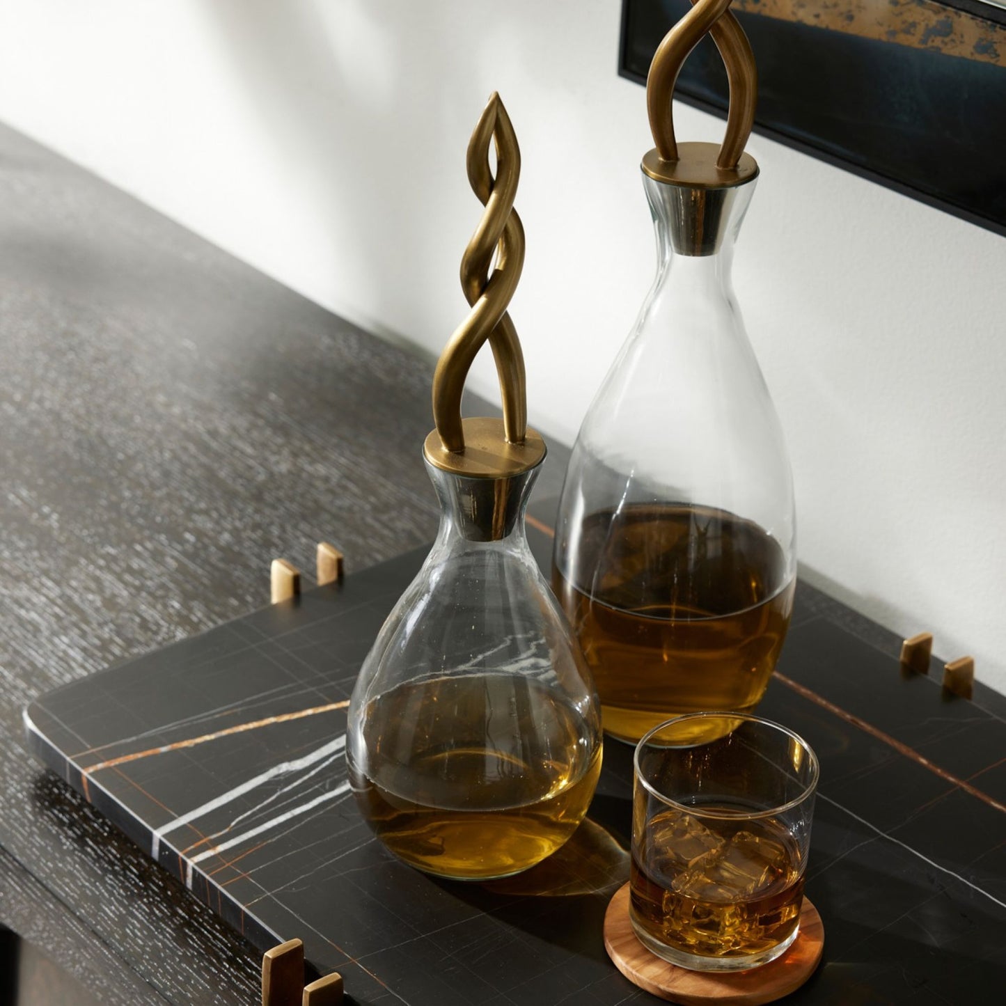 The Elixir Decanters Set of 2 in Smoke Luster from Arteriors Home is a dynamic addition to any tabletop tableau. Jewelry-inspired vintage brass stoppers twist and spiral upwards, mimicking a calming plume of smoke from burning incense. The Elixir Decanters are one of a kind and are sure to stand out displayed on a table or bar cart.