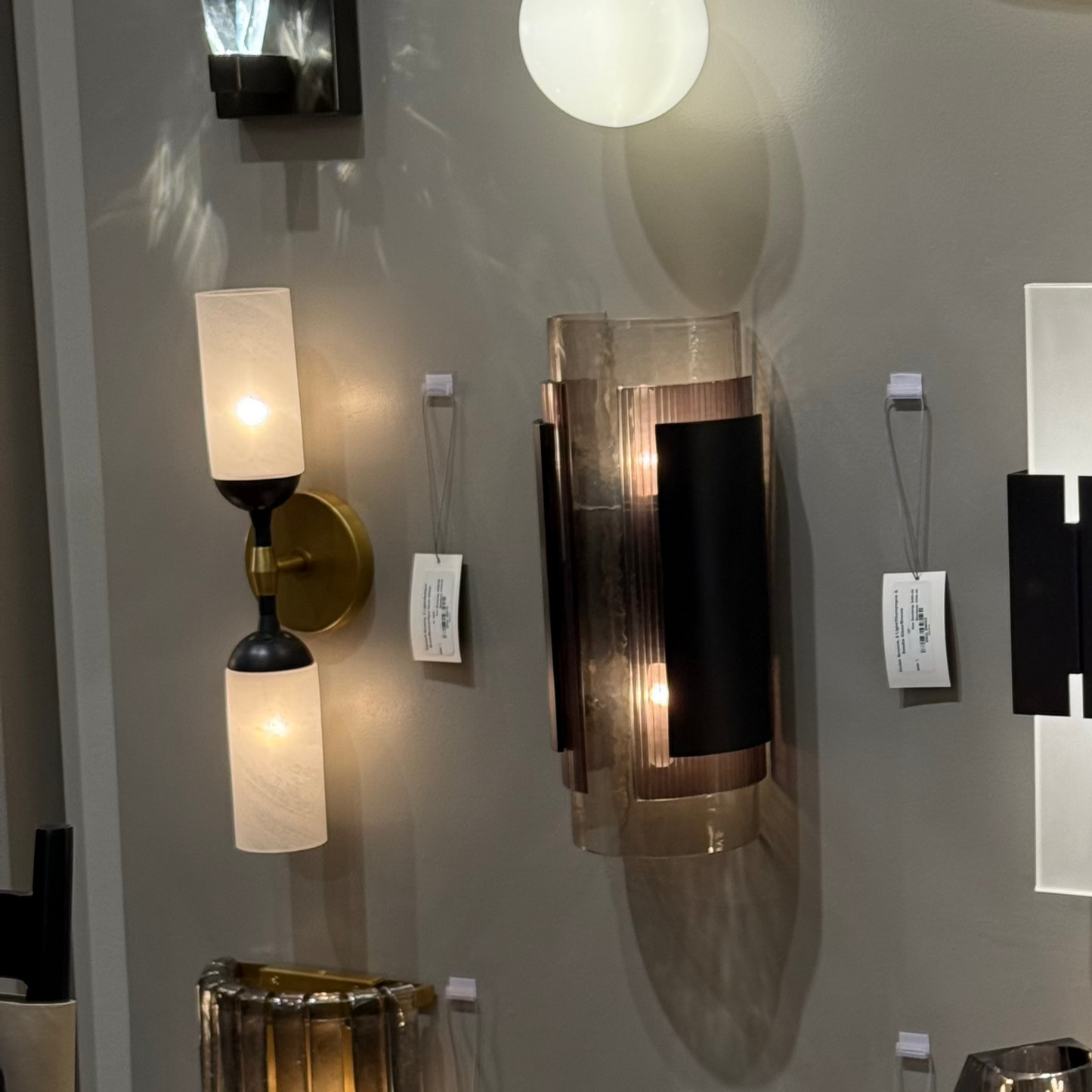 The Emmett Sconce in Bronze and Brass from Arteriors Home showcases a set of swirl glass shades in a matte finish that resembles snow marble. The Emmett can be installed horizontally or vertically.