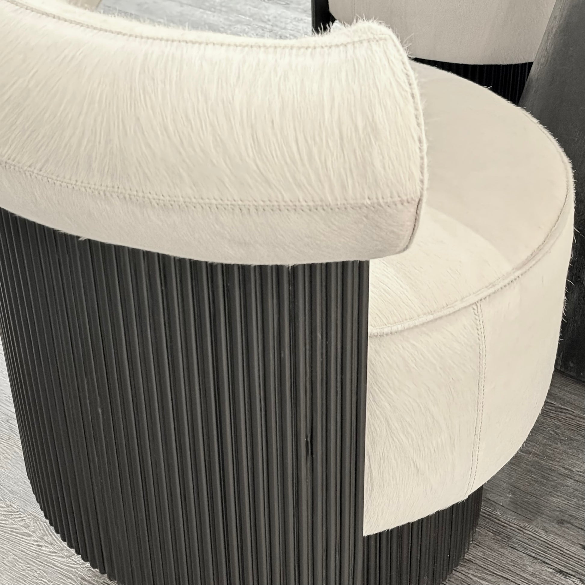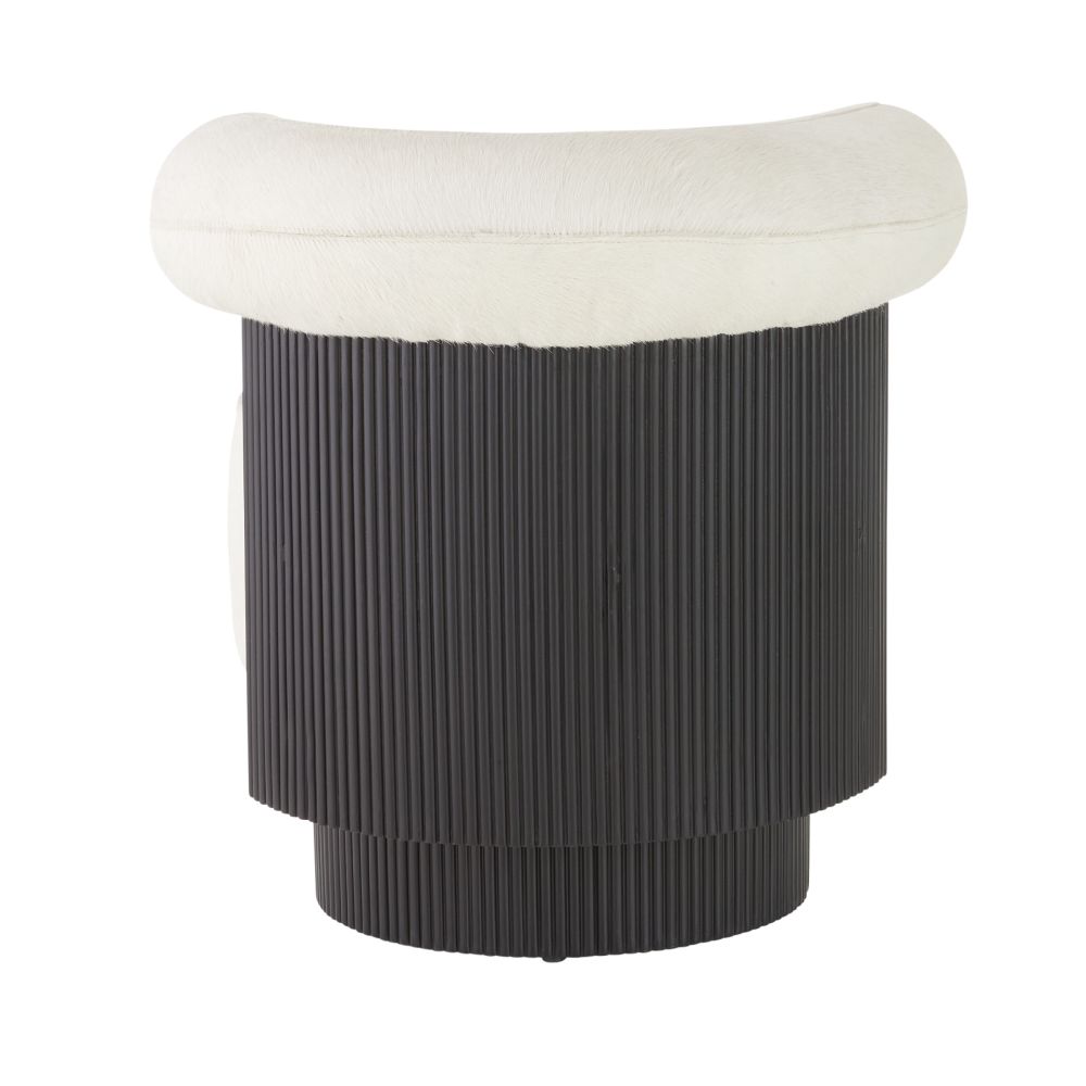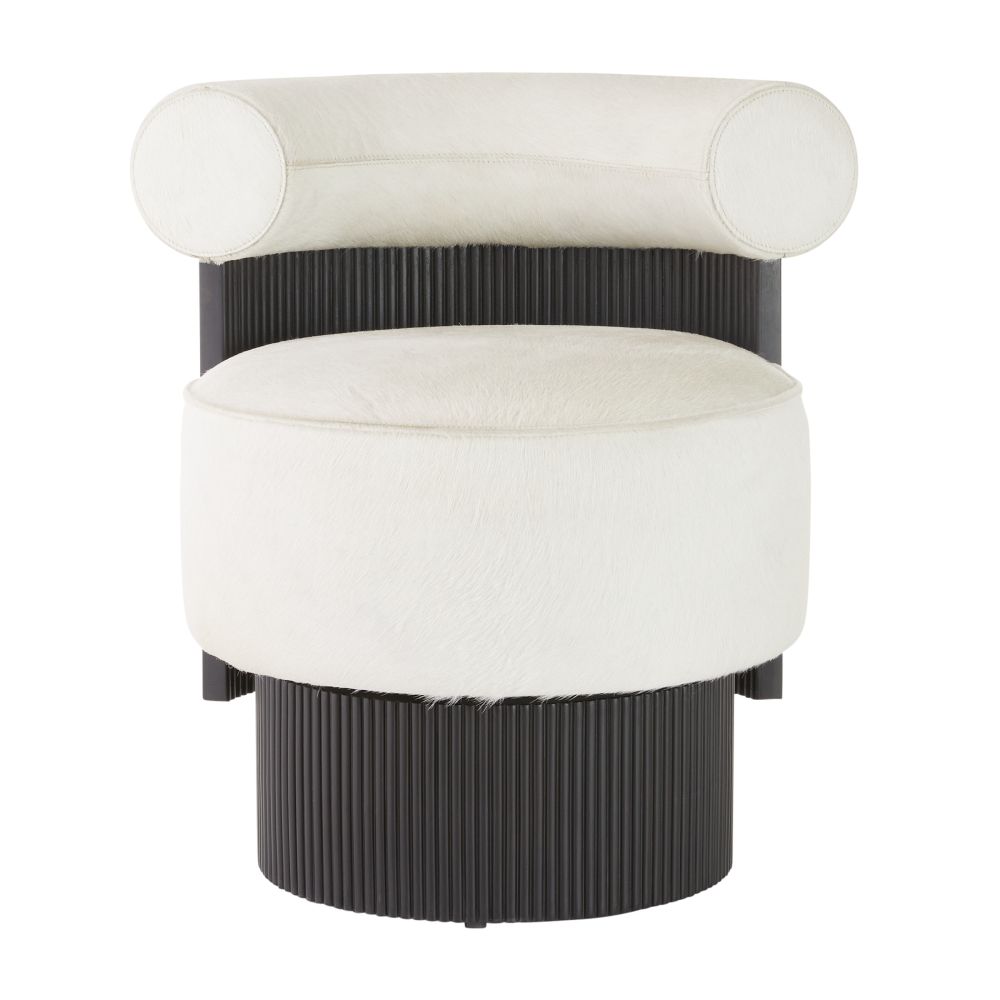 The traditional swivel Erhart Chair in White Hair-on-Hide from Arteriors Home is enhanced with a tubular bolster back for a playful—yet comfortable—edge. Designed in soft white hair-on-hide, it features textural reeded beech wood details of ebony.