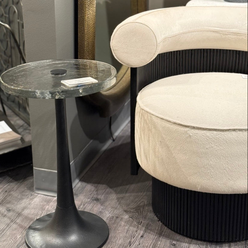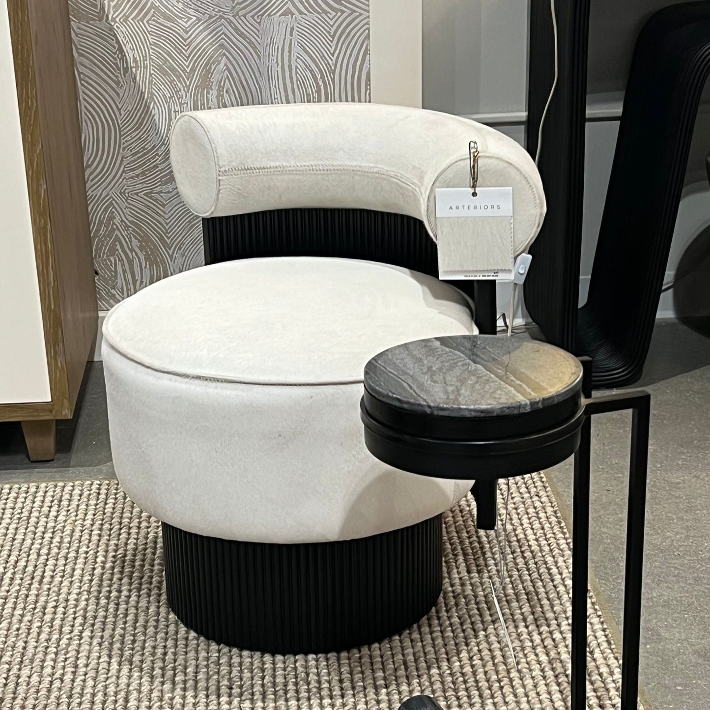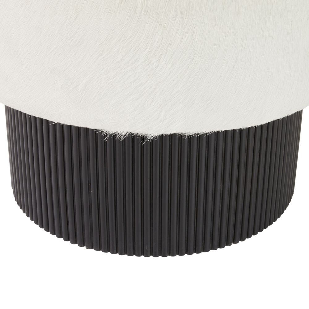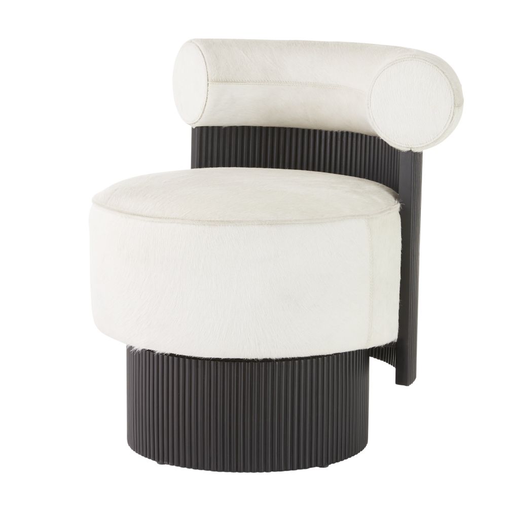 The traditional swivel Erhart Chair in White Hair-on-Hide from Arteriors Home is enhanced with a tubular bolster back for a playful—yet comfortable—edge. Designed in soft white hair-on-hide, it features textural reeded beech wood details of ebony.