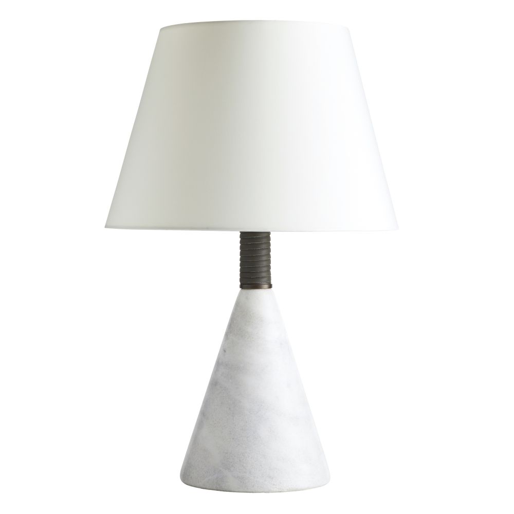 The simple form of the Everly Lamp in Graphite Leather and Marble from Arteriors Home brings the allure of its materials into sharper focus. A conical white marble base is wrapped at the top in graphite leather, then adorned with a traditional drum shade of ivory microfiber.