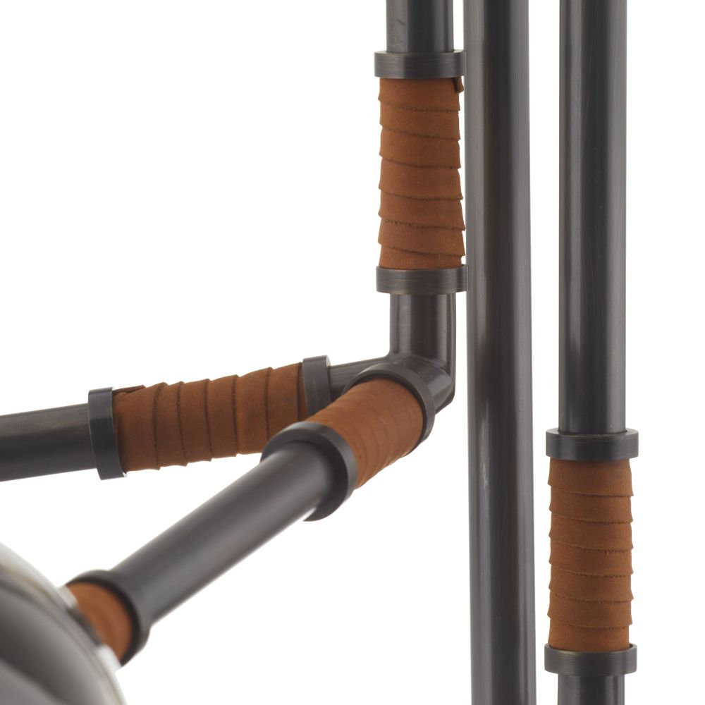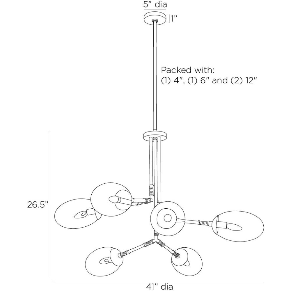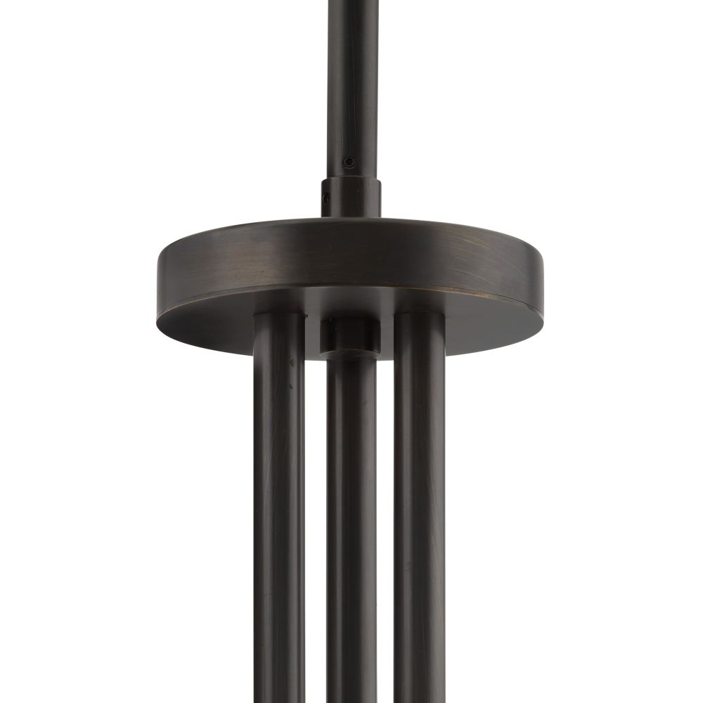 The Falcon Chandelier Smoke by Arteriors Home features an industrial English bronze-plated iron style, accented with cognac leather for a textured touch. It is mounted on a slim iron pipe with fixed branches, each adorned with a smoke glass globe to evenly disperse light in all directions.