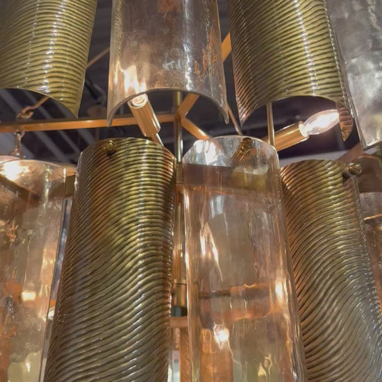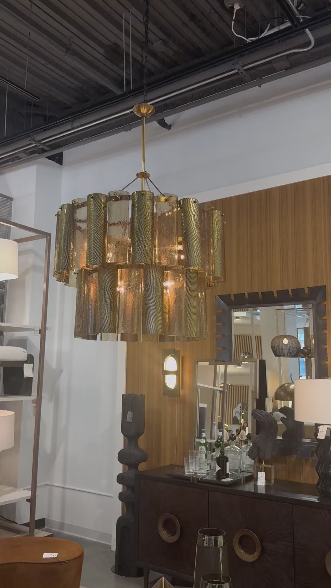 Designed for high ceilings, the Faramond Chandelier in Vintage Brass from Arteriors Home features a two-tiered Empire silhouette adorned with faux bois-etched leaves of vintage brass-plated iron and smoke slump hammered glass. Suspended from a brass-plated pipe and canopy, it creates a stunning striped effect.