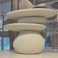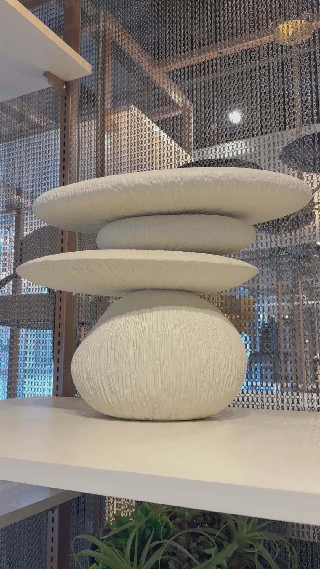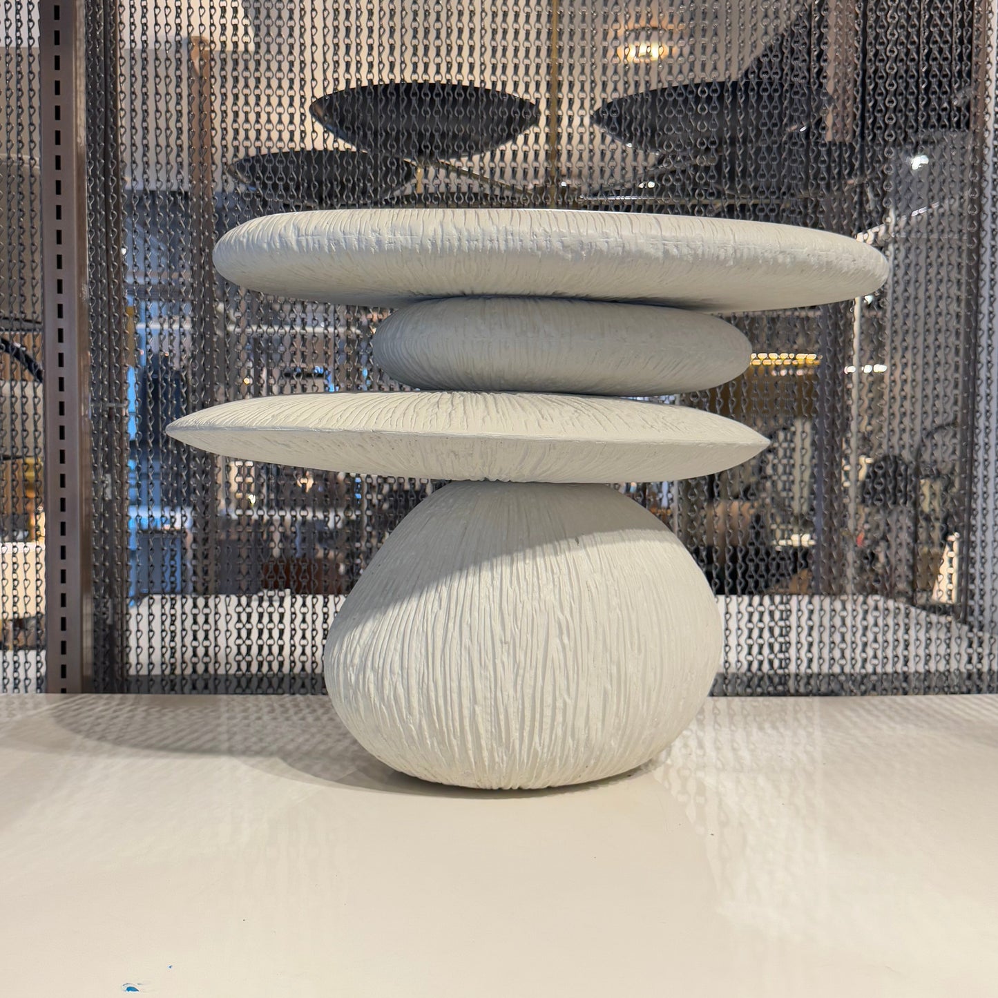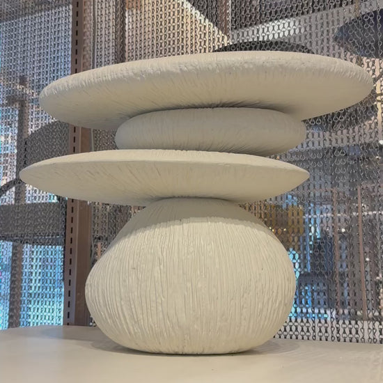 The Felicia Outdoor Accent Table by Arteriors Home features an ivory concrete composite construction with a gravity-defying form inspired by stacked stones. The heavily veined texture adds to its evocative appearance, reminiscent of Andy Goldsworthy's sculptures.
