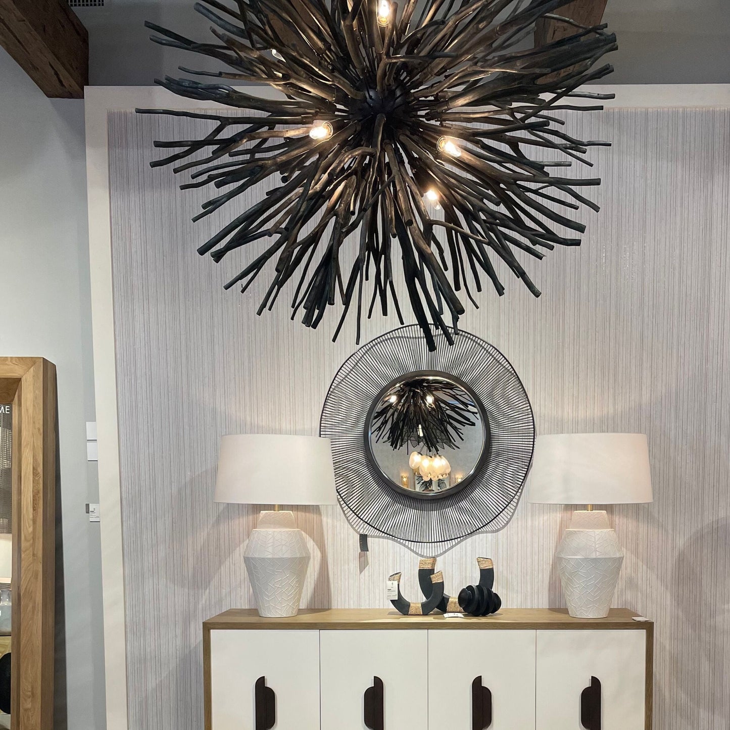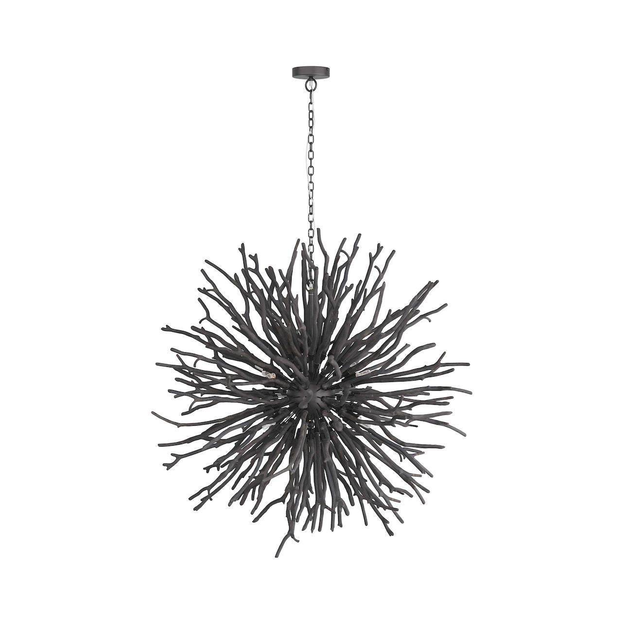 An organic take on the classic starburst design, the Finch Chandelier in Dark Gray Wash from Arteriors Home features dark gray washed branches growing from a concealed black iron frame. Each of the eight lights seemingly blend into the structure until they bring it to life when lit, casting beautiful shadows across a space.