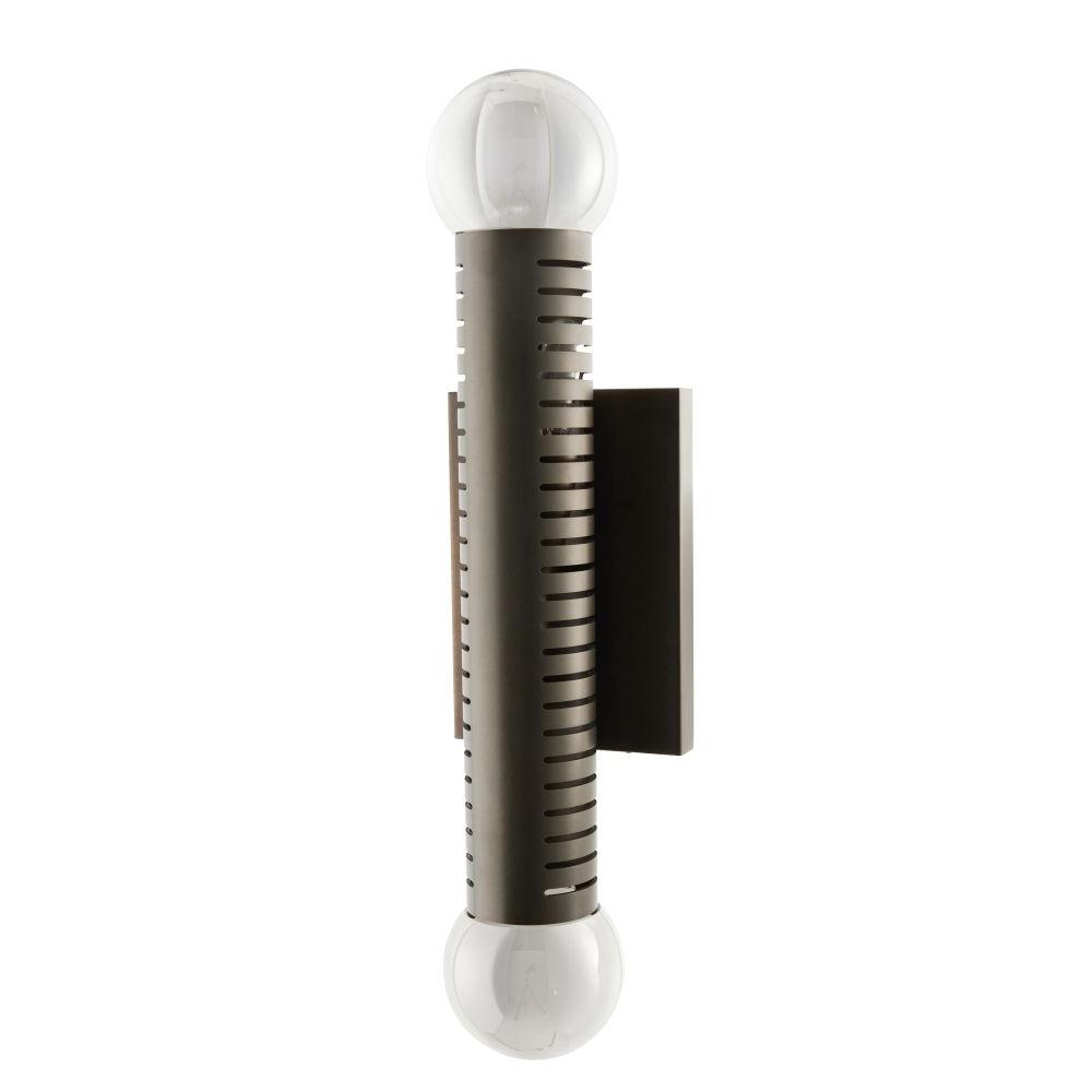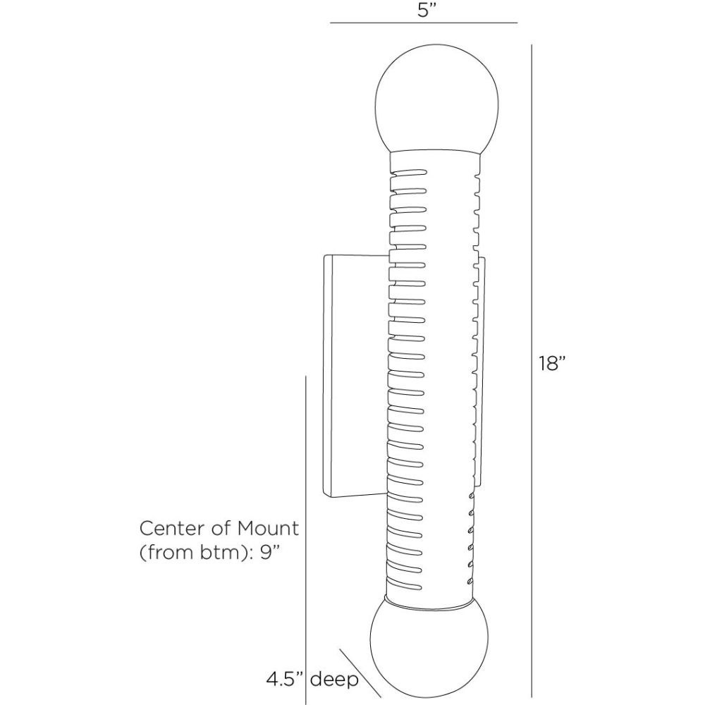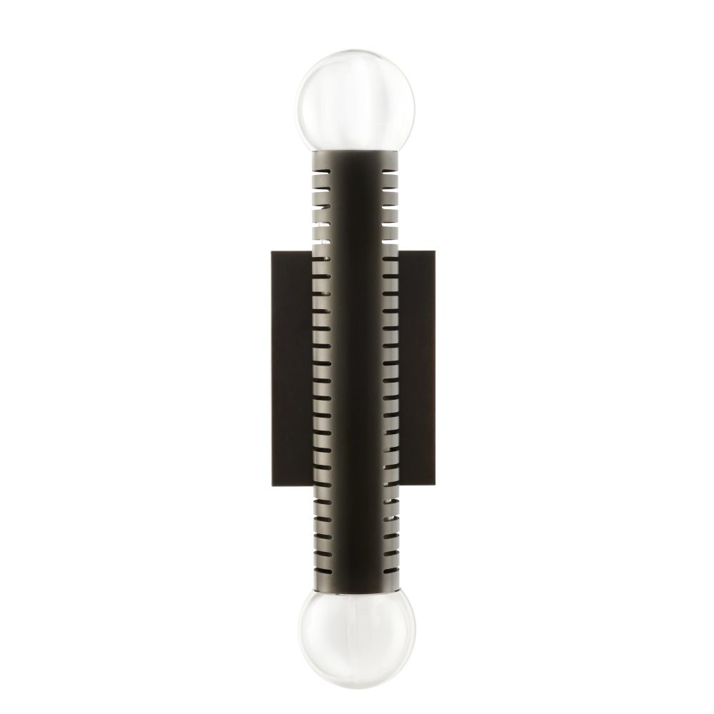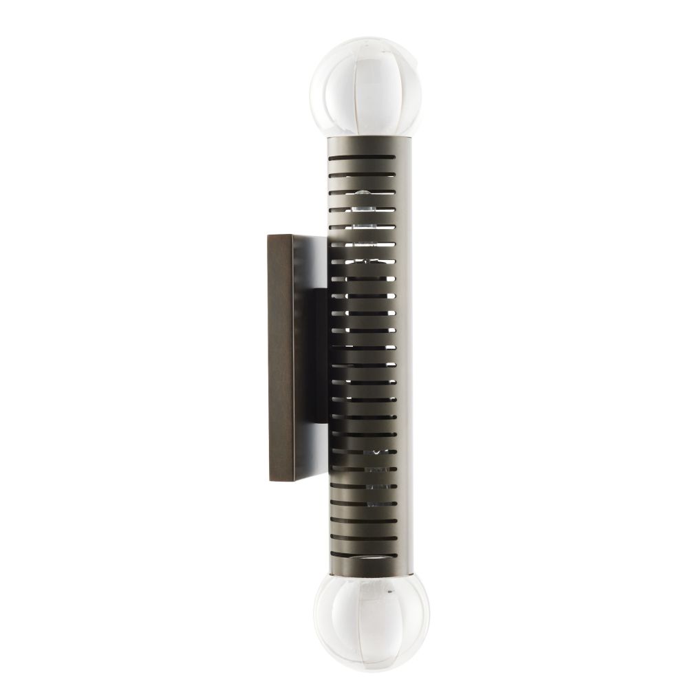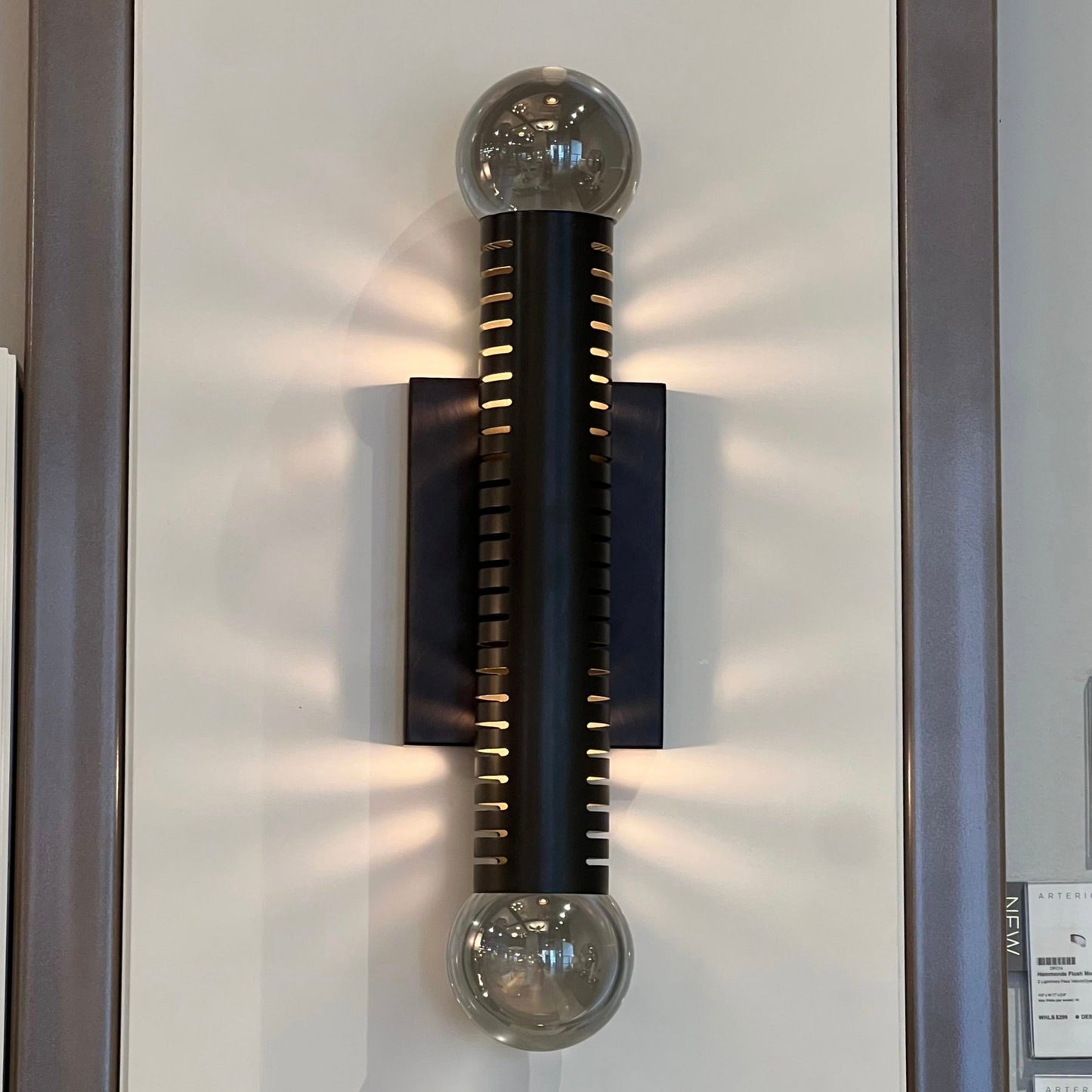The Flume Sconce Bronze from Arteriors Home combines linear and circular design elements to create a striking architectural presence in hallways and corridors. Slotted perforations provide a mesmerizing diffusion of light.