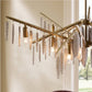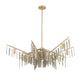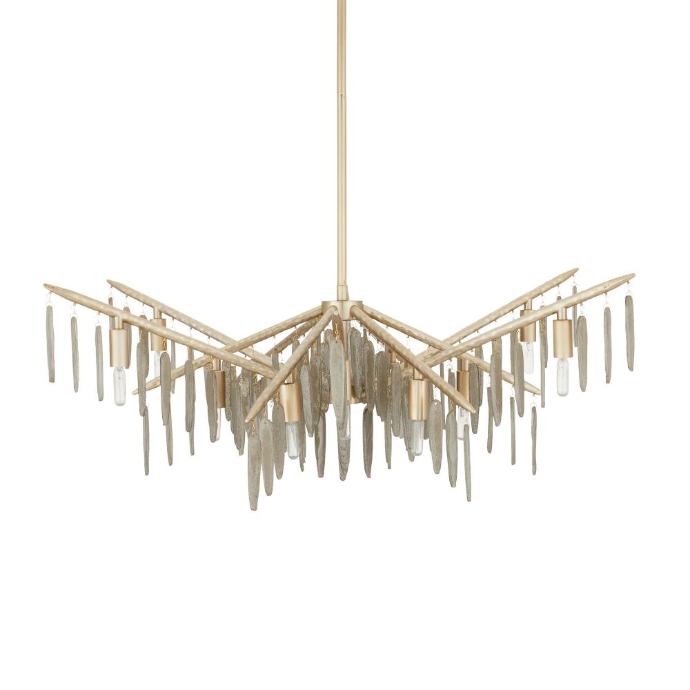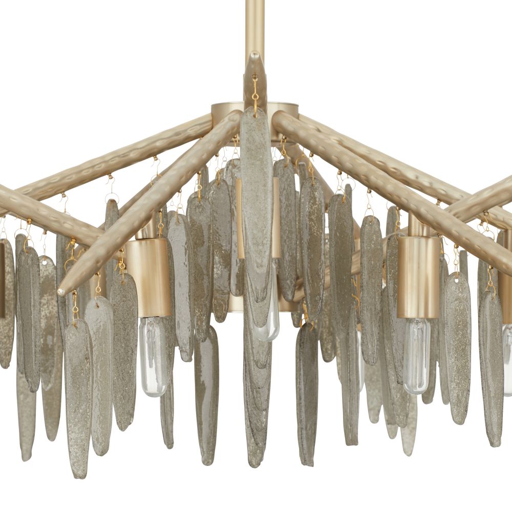 Inspired by the icicles on an evergreen tree, the Gia Chandelier in Smoke Seedy Glass by Arteriors Home features accents of smoke seedy glass dripping from its branches. The champagne hammered iron fixture boasts angular arms with a faux bois texture, and it disperses light throughout the room with its twelve bulbs.