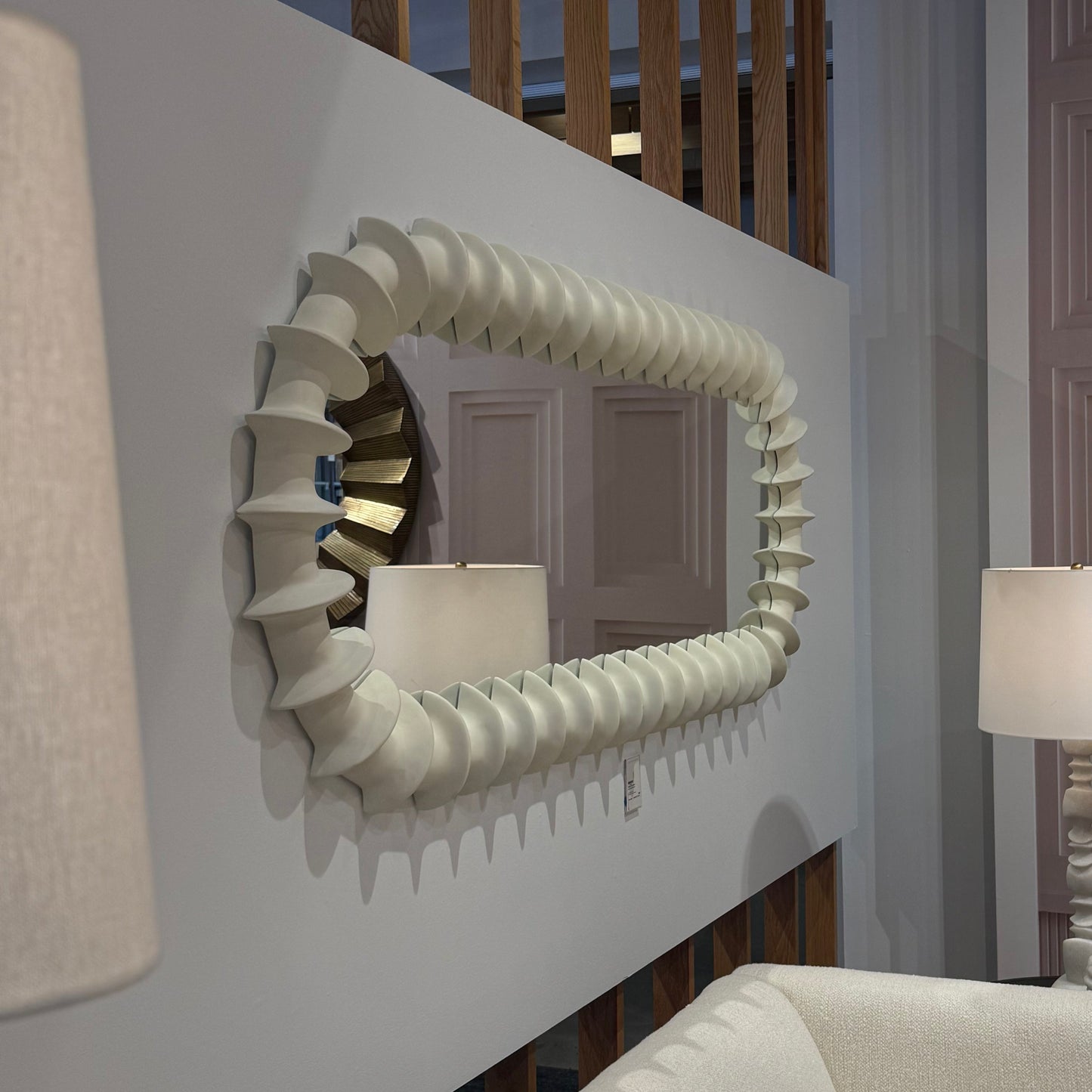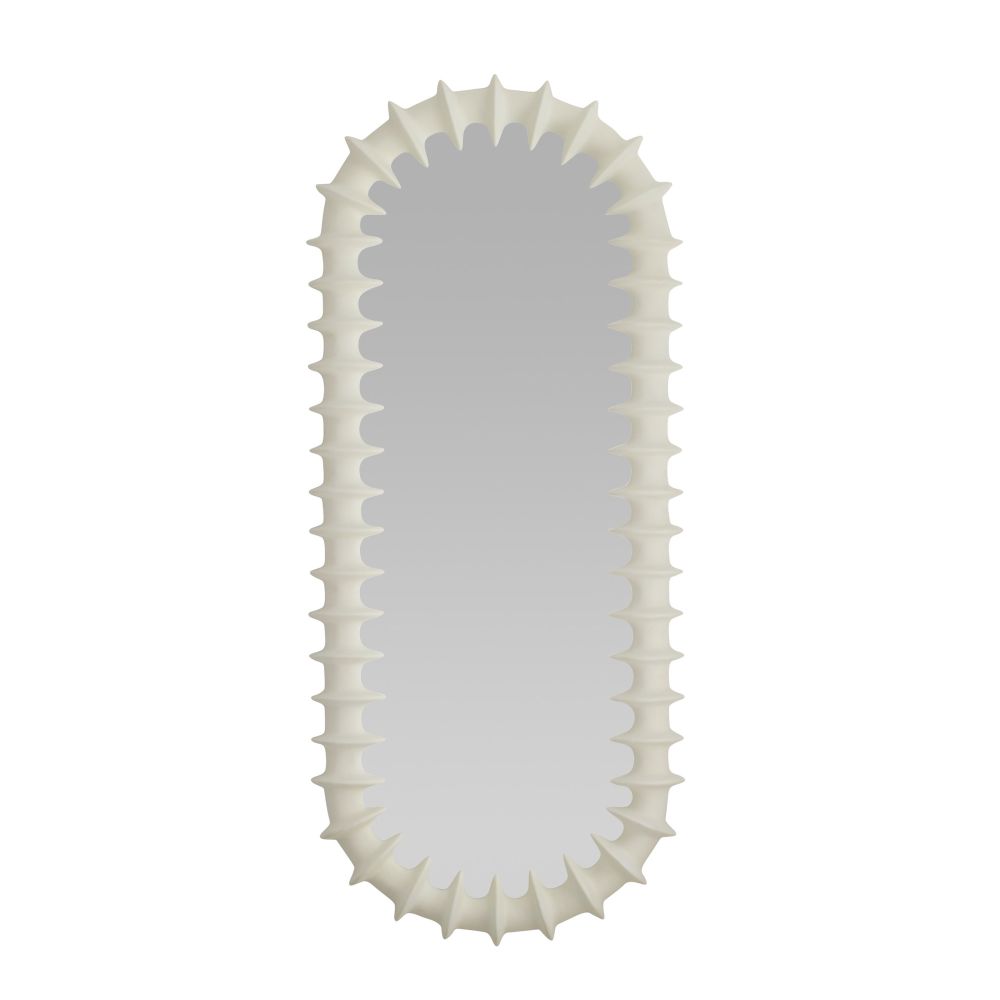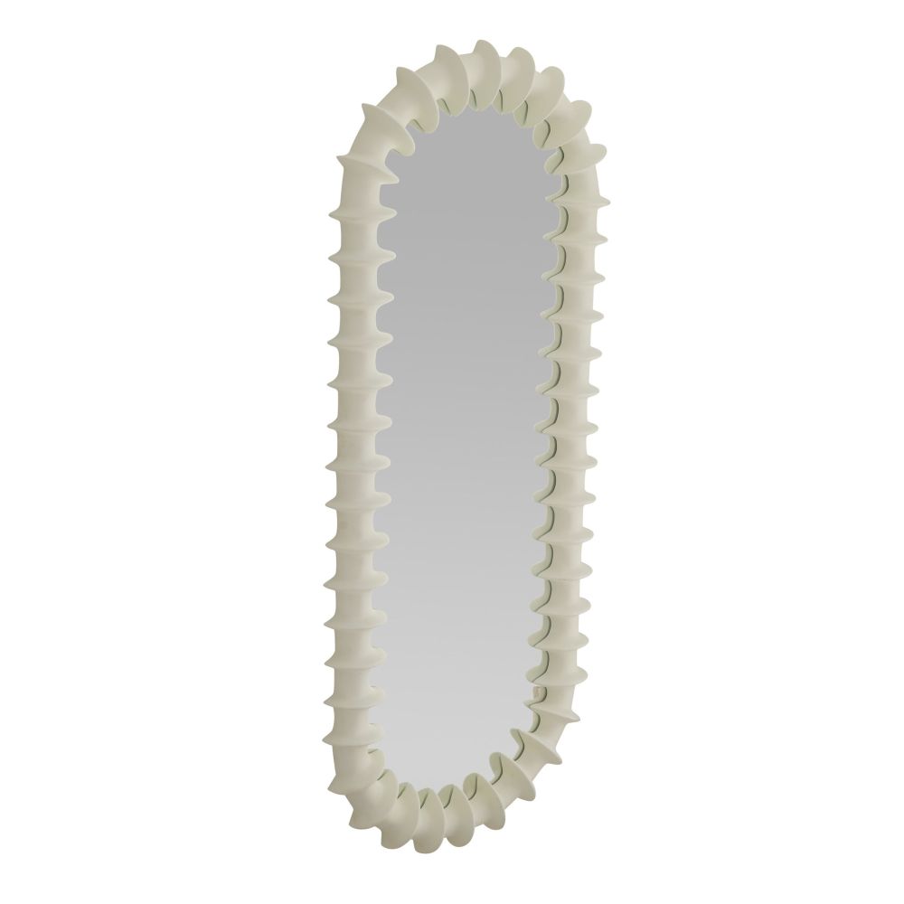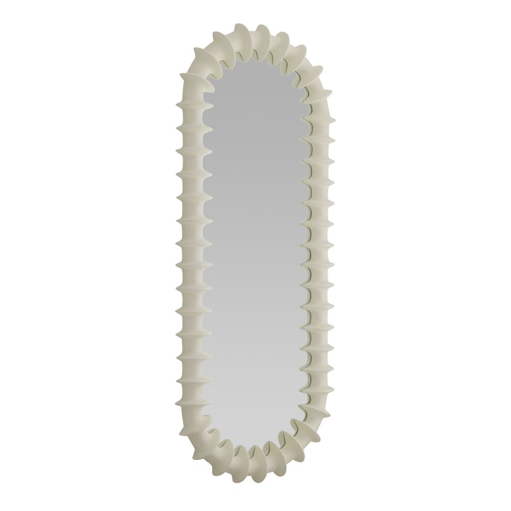 The Gilcrest Floor Mirror by Arteriors Home boasts a textured frame constructed of matte ivory resin, resembling the natural ridges of a spine. This unique finish adds depth and interest to any wall it adorns.