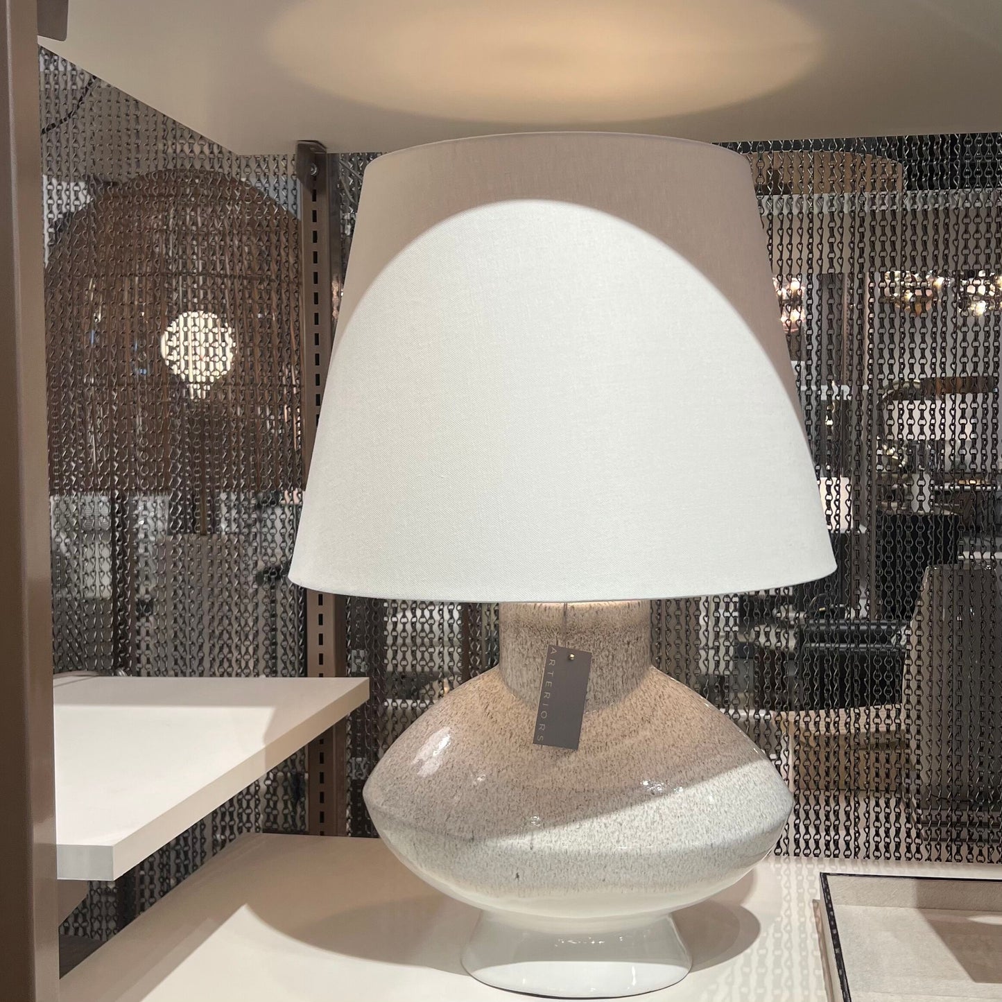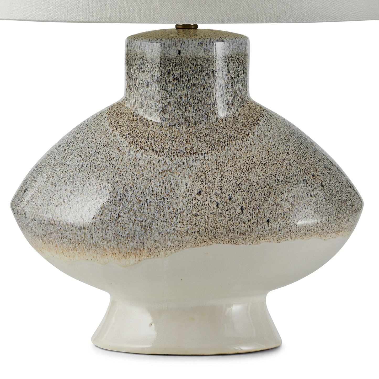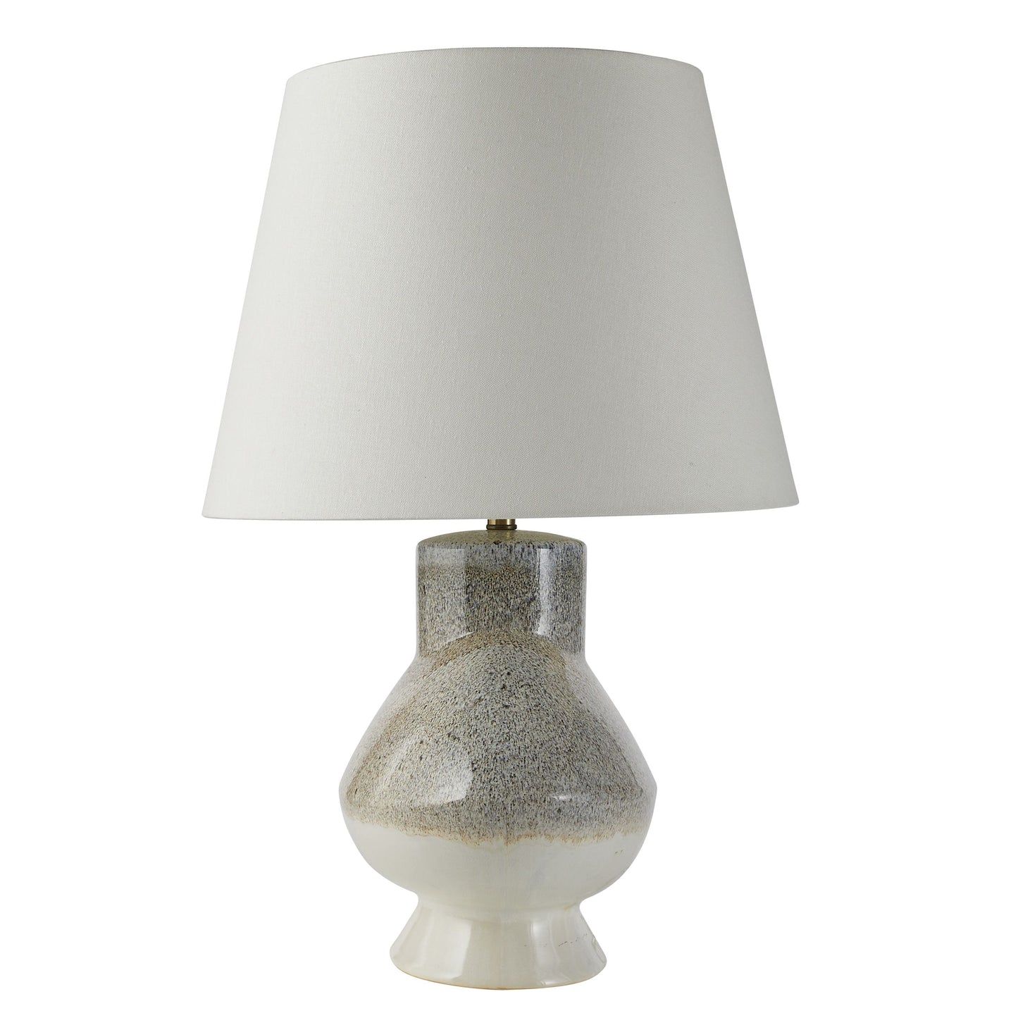 The Ginn Lamp in Ceramic from Arteriors Home features pebble reactive glaze that results in a one-of-a-kind fixture. A brown irregular drip line highlights the irregular urn shape and is even more impactful when illuminated.