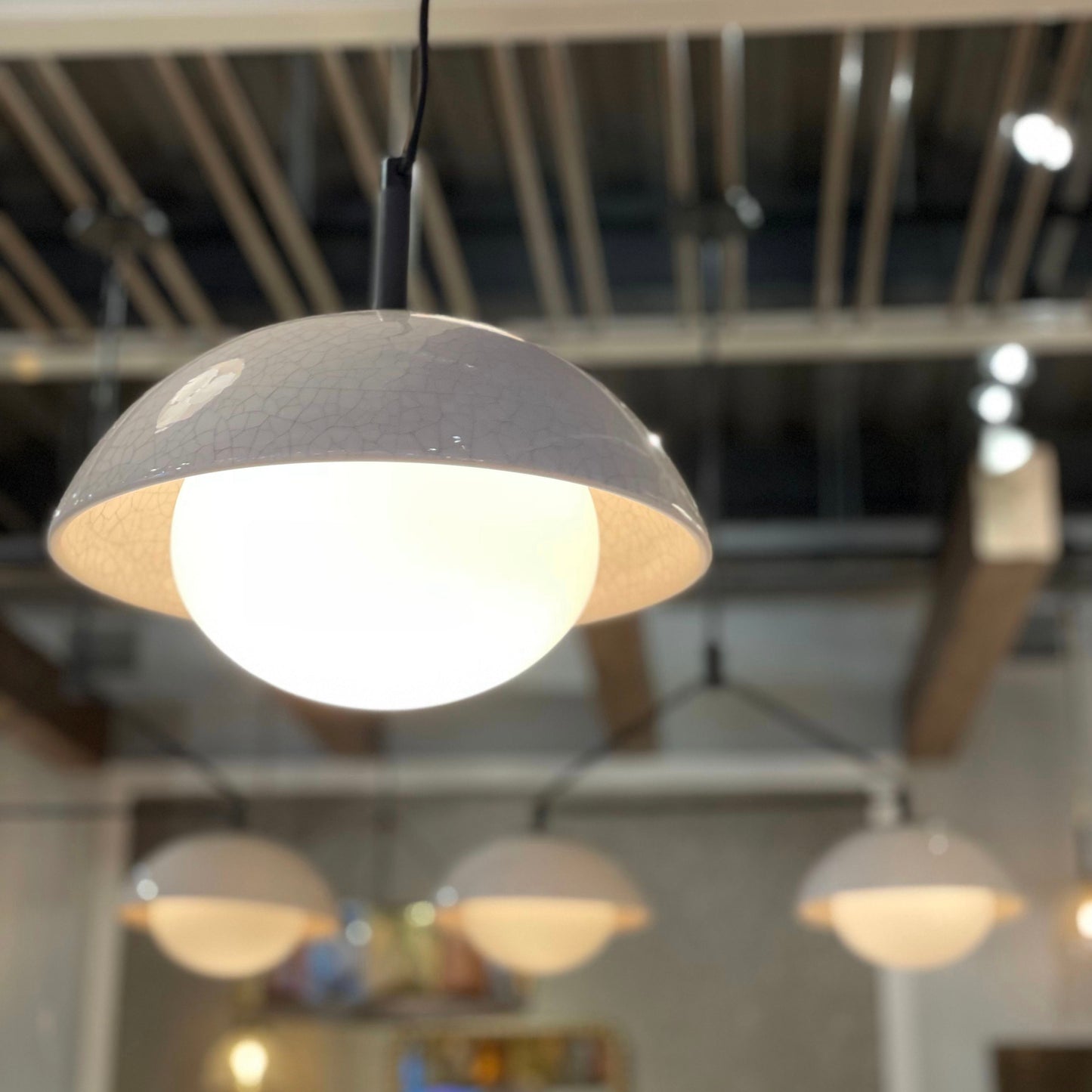 The Glaze Pendant Ivory Crackle is influenced by exquisite glazed dishes and pottery, showcasing the skilled craftsmanship of the artisan. Its angular blackened steel framework is accented with textured knurling and paired with round ceramic shades in a unique ivory-stained crackle glaze and gentle frosted glass.
