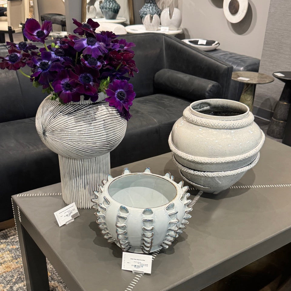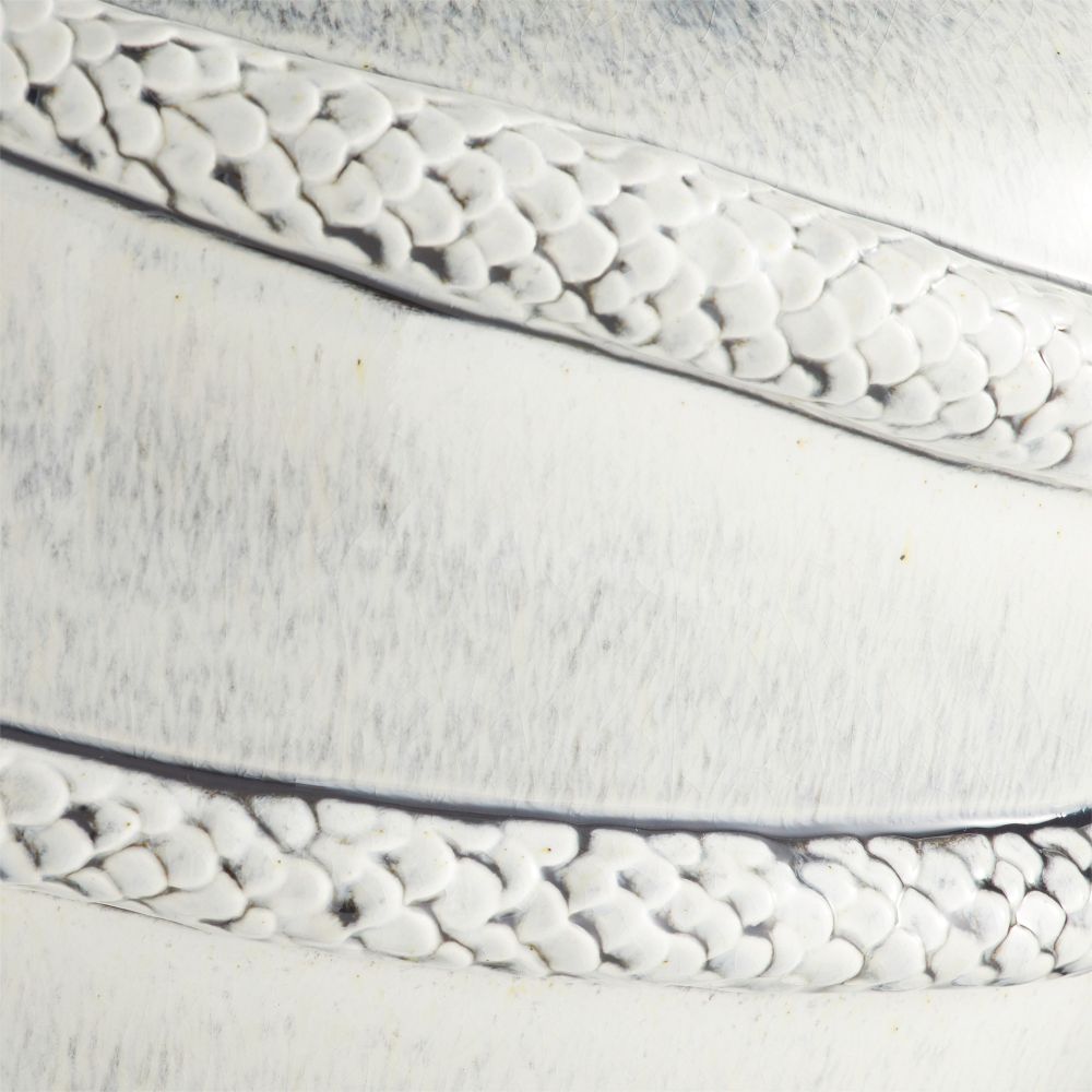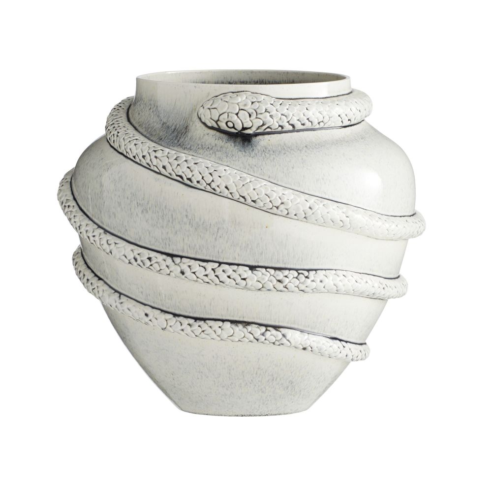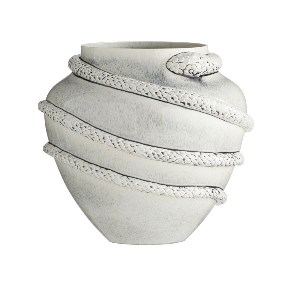 The Godsick Vase Glazed by Arteriors Home features a striking serpentine shape that showcases its impressive size. Made of porcelain and finished with an ice-reactive glaze, this vase captures the essence of animal energy and accentuates its intricate sculptural elements.